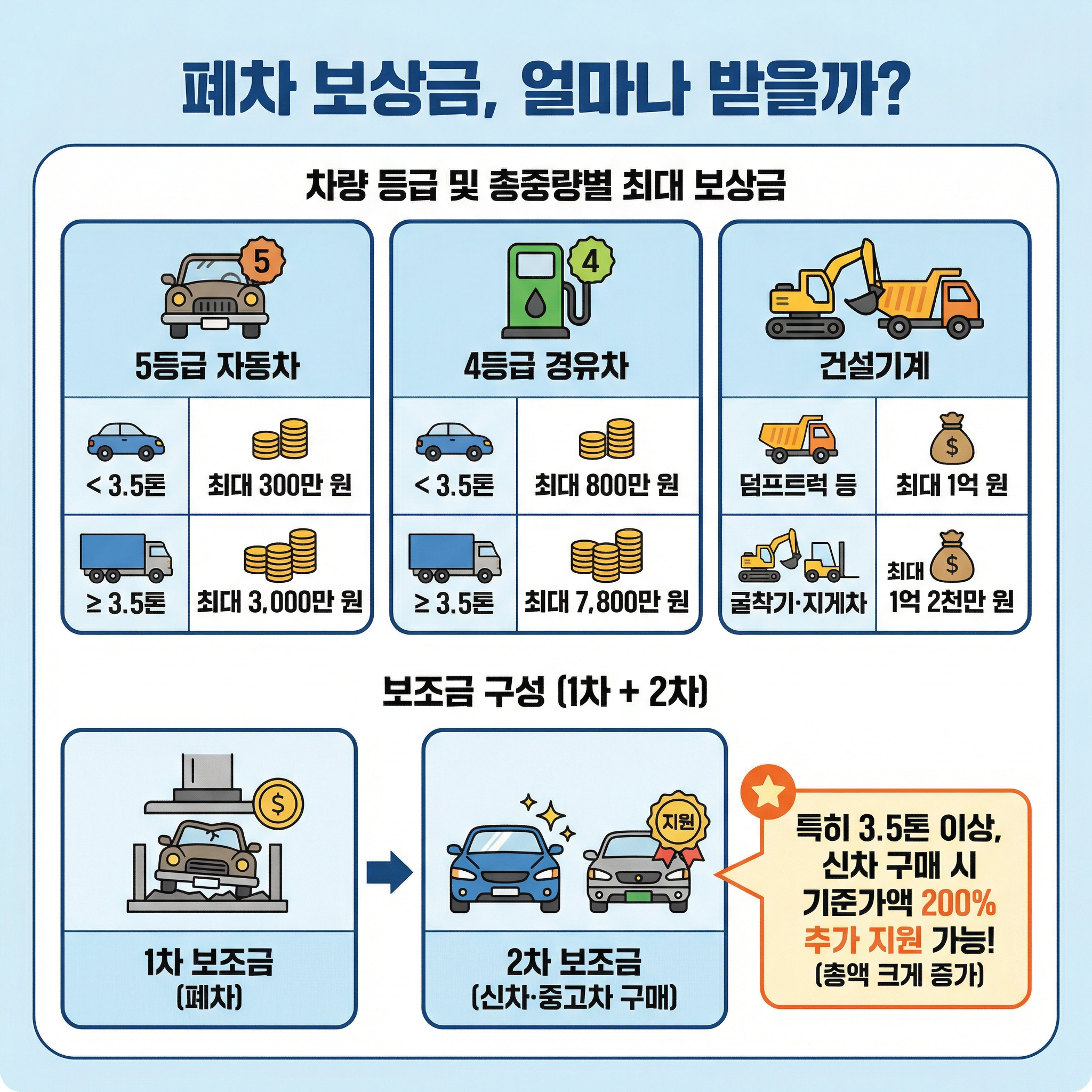 폐차 보상금은 기본 1차 보조금(폐차)과 2차 보조금(신차·중고차 구매)으로 나뉘어요. 특히 3.5톤 이상 차량은 신차 구매 시 기준가액의 200%까지 2차 지원이 가능해 폐차 보상금 총액이 크게 늘어날 수 있어요.