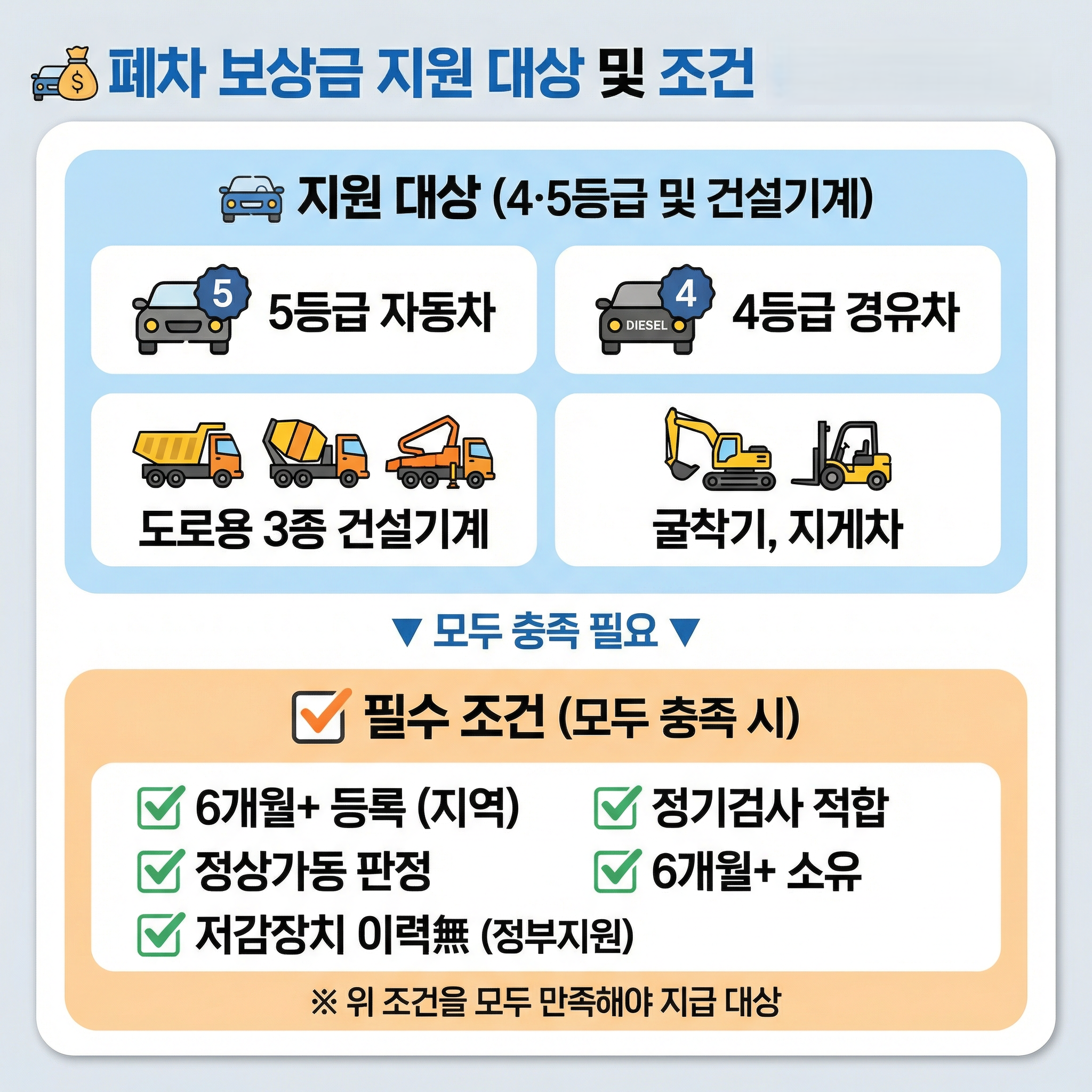 폐차 보상금은 배출가스 4등급·5등급 경유차 및 일부 건설기계를 대상으로 지원돼요.