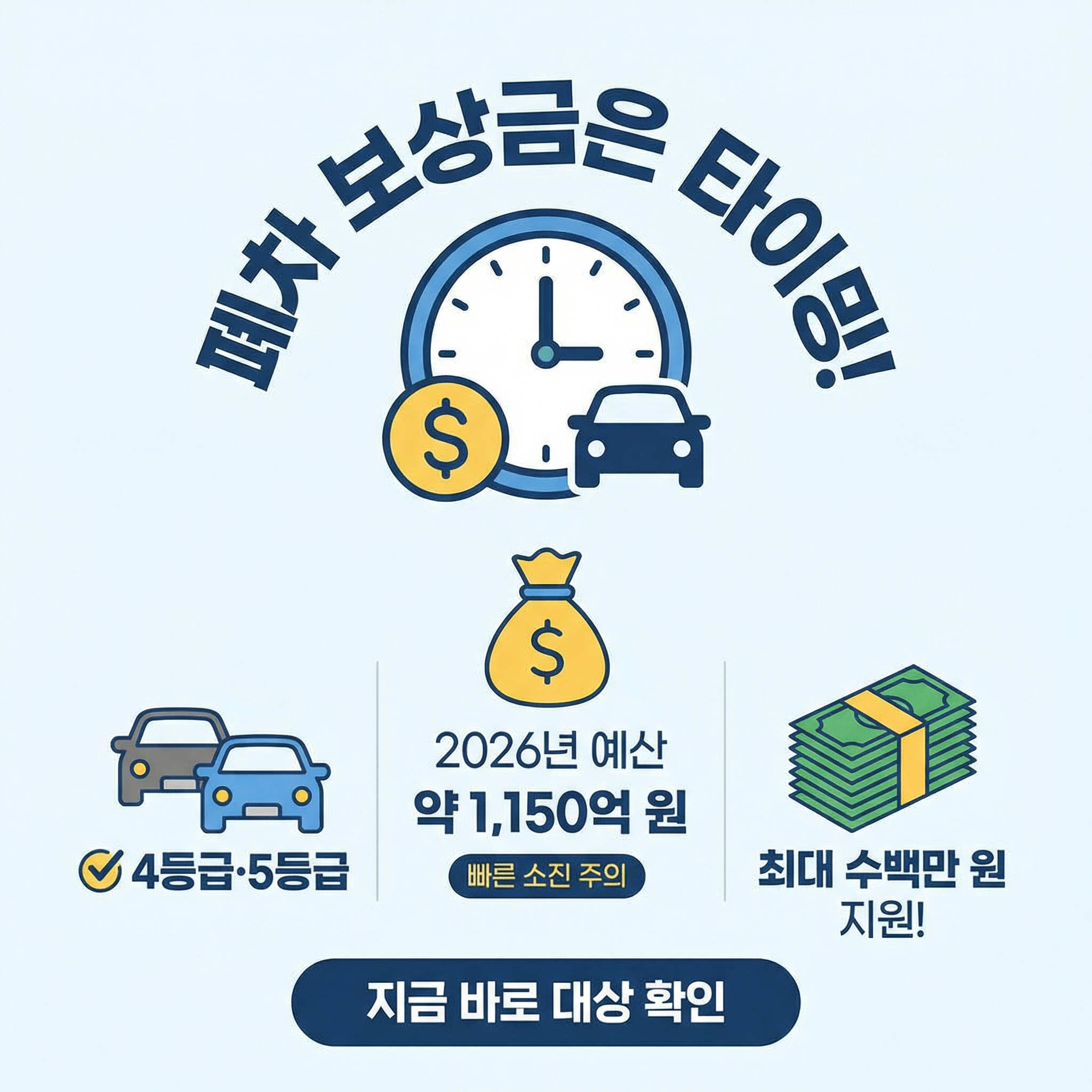 2026년에도 폐차 보상금 예산은 약 1,150억 원 규모로 편성되어 있어요 하지만 지역별 예산이 빠르게 소진되는 편이에요.