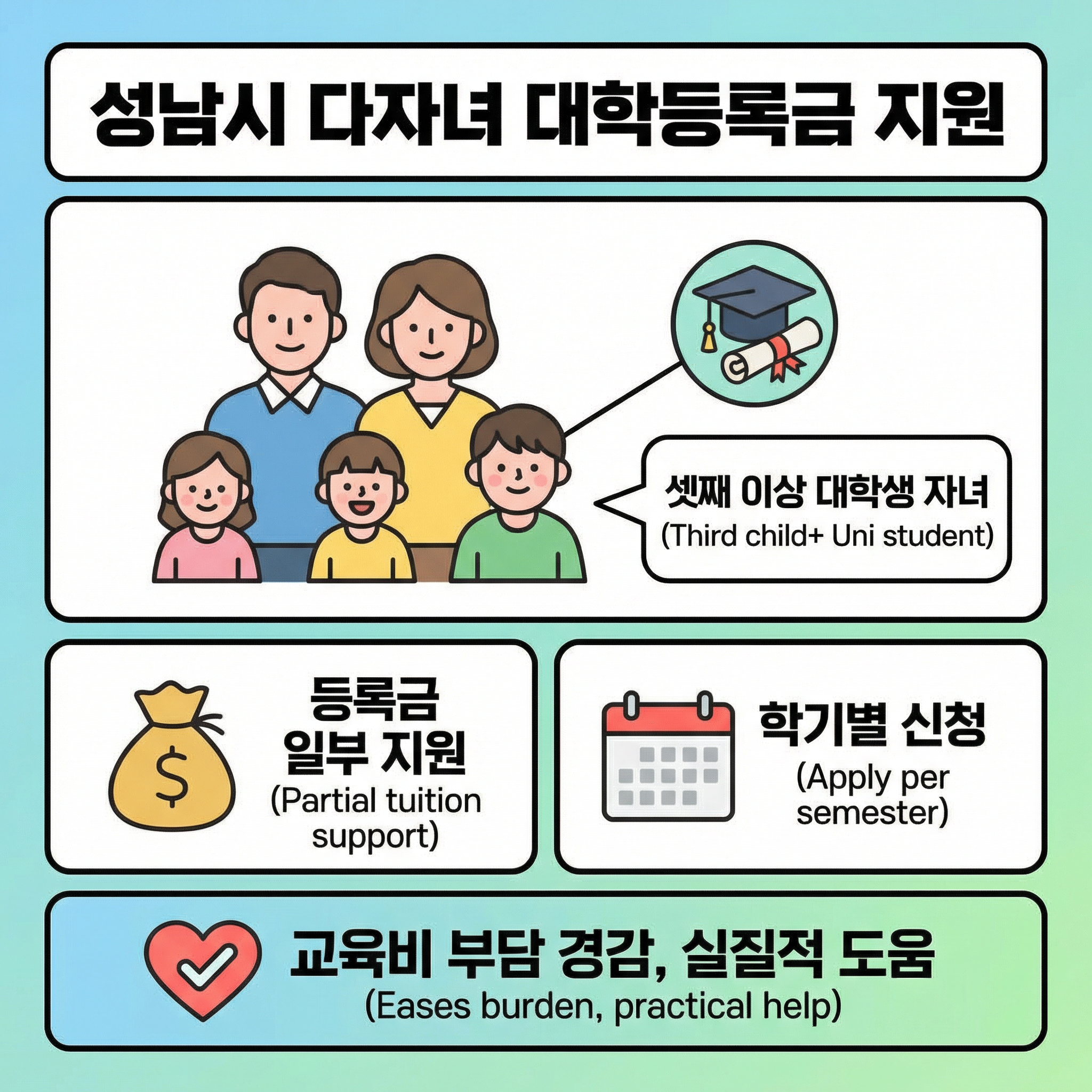 요즘 대학 등록금 부담 때문에 고민하는 가정이 정말 많아요. 특히 자녀가 여러 명인 가정이라면 교육비 부담이 훨씬 크게 느껴질 수 있는데요. 이런 부담을 덜어주기 위해 성남시에서 다자녀 대학등록금 지원 제도를 운영하고 있어요.