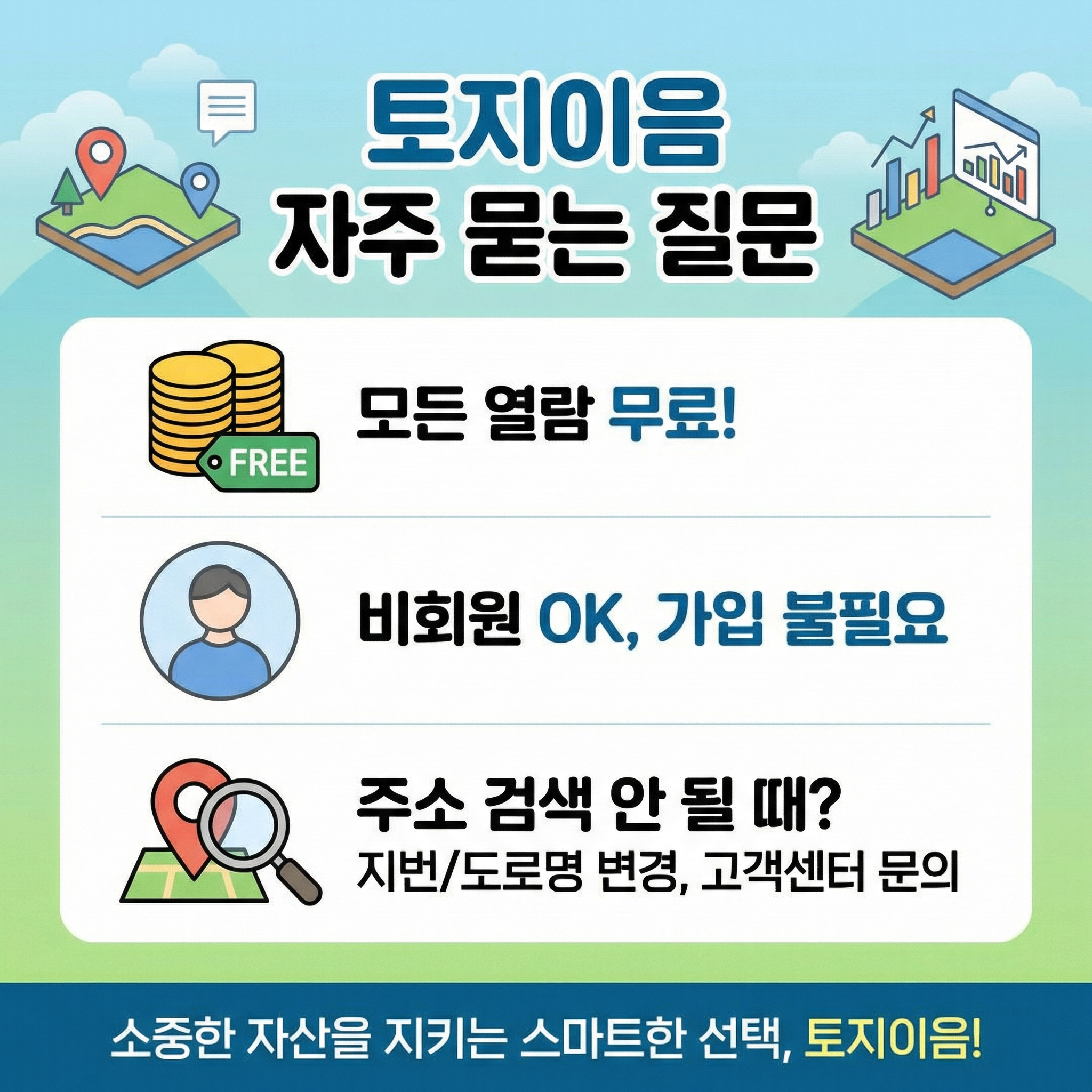 많은 분이 토지이음 이용료가 무료인지 물어보시는데, 네 맞아요! 토지이음의 모든 공적 장부 열람 서비스는 무료로 제공돼요. 토지이음은 회원가입 없이도 비회원으로 충분히 조회가 가능하니 부담 없이 이용해 보세요. 만약 토지이음에서 주소 검색이 안 된다면 주소 입력 방식(지번/도로명)을 바꿔보거나 토지이음 고객센터 도움을 받는 것이 좋아요. 설명해 드린 토지이음 정보가 여러분의 소중한 자산을 지키는 데 큰 도움이 되었으면 좋겠어요.