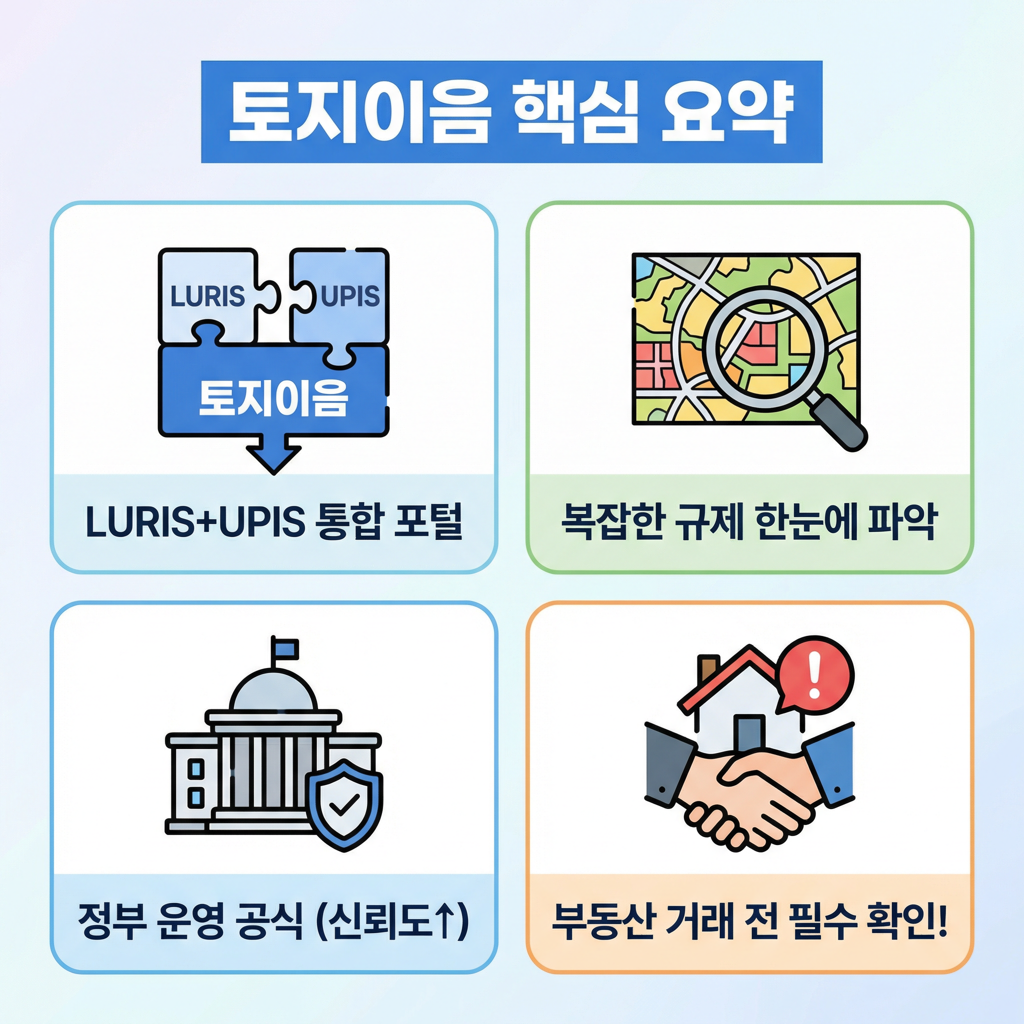토지이음은 기존에 분리되어 있던 ‘LURIS(토지이용규제정보서비스)’와 ‘UPIS(도시계획정보서비스)’를 통합하여 제공하는 종합 포털 사이트예요. 토지이음을 통하면 복잡한 토지 규제 정보를 한눈에 파악할 수 있어서 정말 편리해요. 특히 토지이음은 정부에서 운영하는 공식 사이트이기 때문에 정보의 신뢰도가 매우 높다는 장점이 있어요. 부동산 거래 전에는 반드시 토지이음을 통해 해당 토지의 용도를 확인해야 실수를 줄일 수 있답니다.