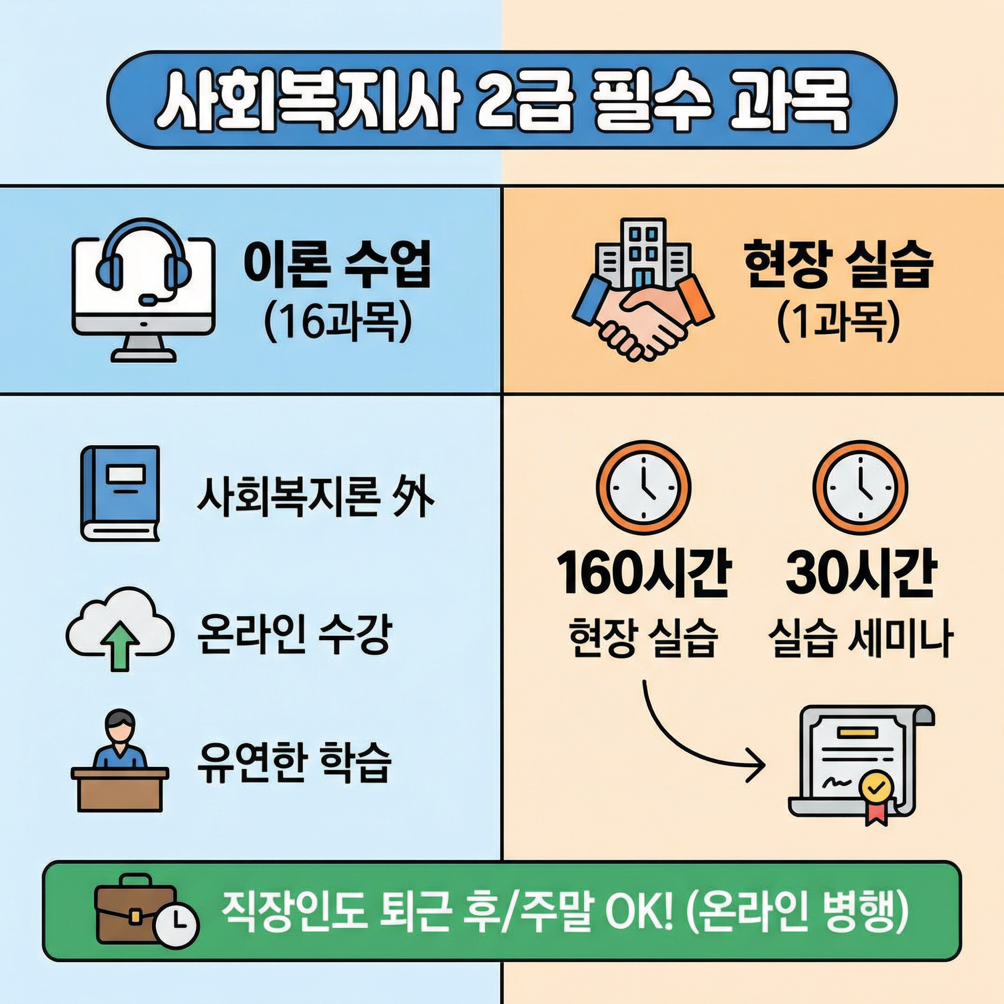 - 이론 수업 (16과목): 사회복지론, 사회복지조사론, 사회복지실천론 등 온라인으로 수강 가능한 과목들이에요.