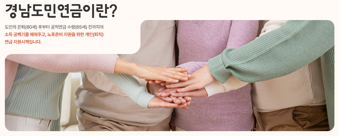 ‘경남도민 연금’은 경상남도에서 직접 운영하는 연금 지원 사업으로, 은퇴 후 국민연금을 받기 전까지의 소득 공백기를 메워주는 제도입니다.