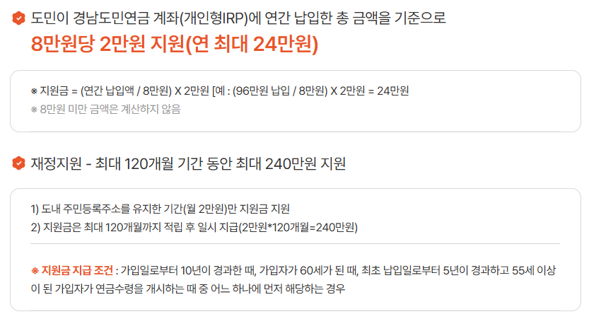 예를 들어 내가 IRP에 96만원을 납입하면, 경남도에서 최대 24만원까지 보태주는 구조죠. 이 제도를 통해 은퇴 이후의 재정 불안을 크게 줄일 수 있어요.