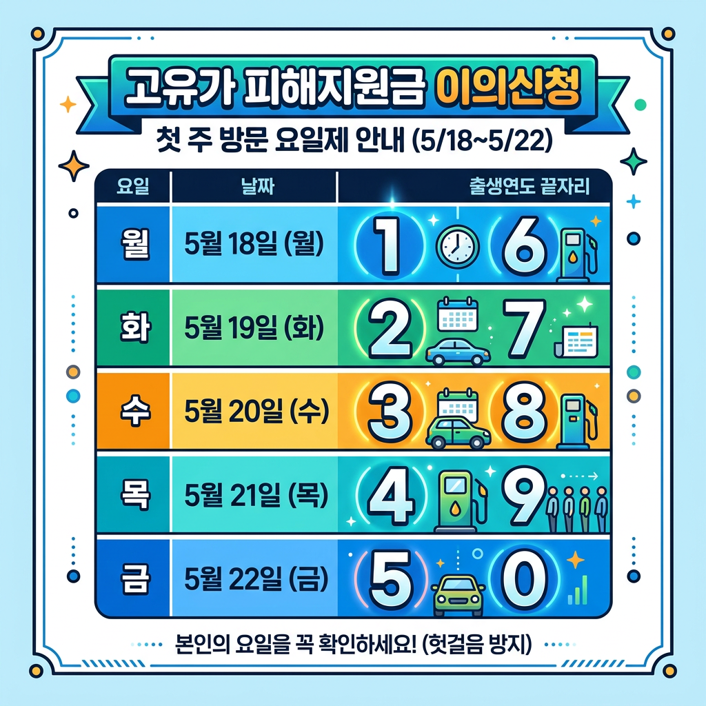 방문 신청 시 혼잡을 막기 위해, 고유가 피해지원금 이의신청 첫 주(5/18~5/22)에는 출생연도 끝자리에 따른 요일제가 적용돼요.