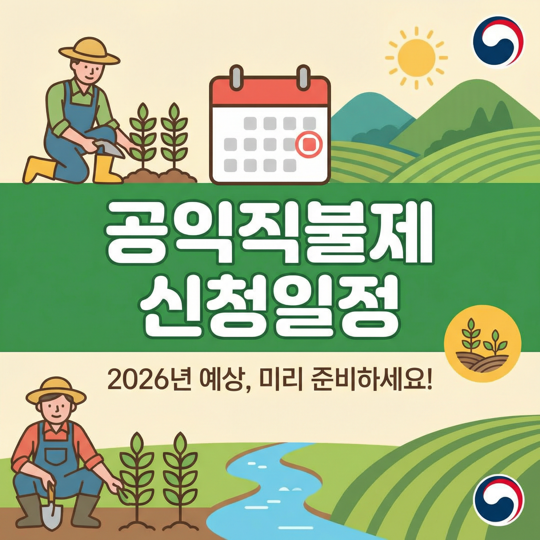 2026년 공식 신청 일정은 아직 최종 확정되지 않았지만, 예년과 유사한 시기에 진행될 가능성이 높아요. 따라서 지금부터 공익직불제 조건과 신청 절차를 미리 준비하는 것이 중요해요.