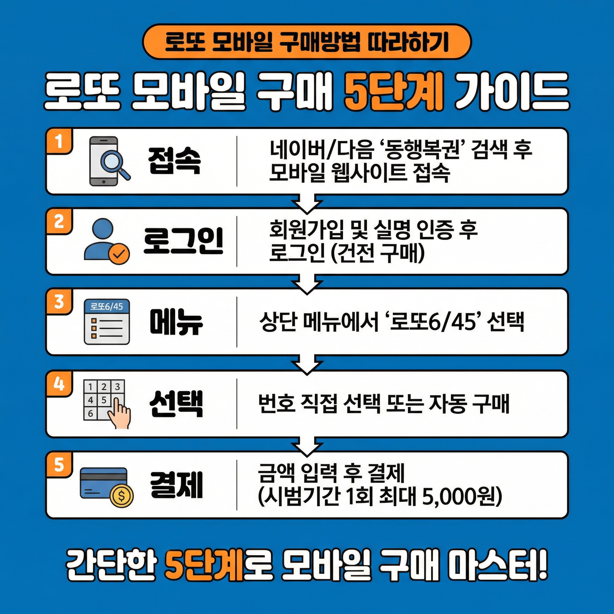 이렇게 간단한 5단계만 익히면, 누구나 로또 모바일 구매방법을 마스터할 수 있어요.