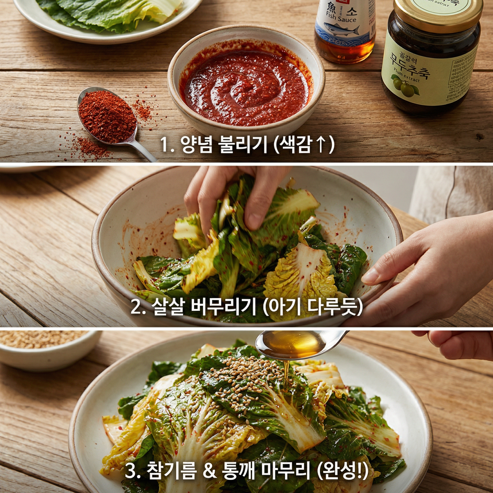 고춧가루와 액젓, 매실액을 먼저 섞어 고춧가루를 충분히 불려주세요. 그래야 봄동 겉절이 황금레시피 완성 후 색감이 아주 예쁘게 나온답니다. 단맛을 좋아하신다면 설탕을 아주 조금 더 추가하셔도 좋지만, 봄동 자체의 단맛을 살리는 것이 진정한 봄동 겉절이의 매력이에요.