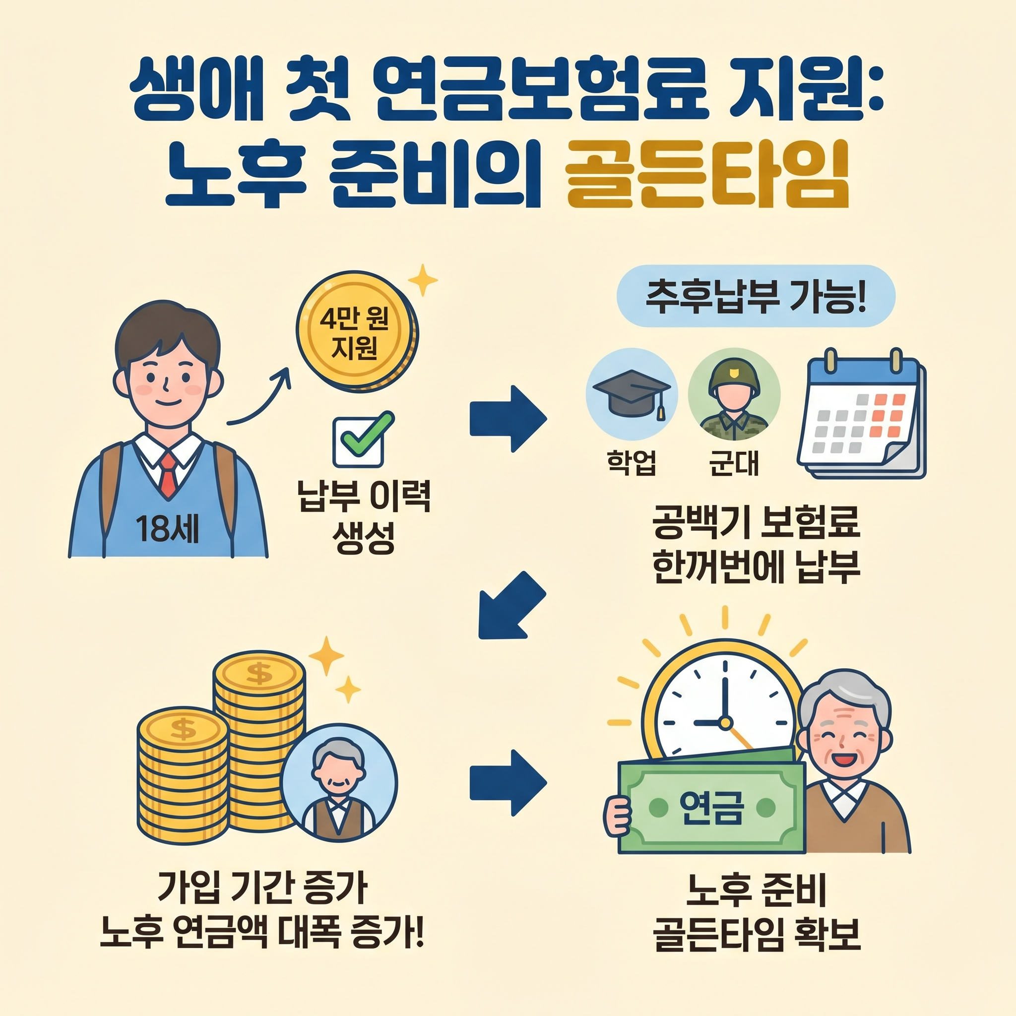 단순히 4만 원을 받는 것보다 더 큰 혜택이 있어요. 바로 '추후납부'가 가능해진다는 점입니다. 생애 첫 연금보험료 지원을 통해 18세에 납부 이력을 만들어두면, 나중에 소득이 생겼을 때 과거의 공백기(학업, 군대 등) 보험료를 한꺼번에 내고 가입 기간을 늘릴 수 있어요. 생애 첫 연금보험료 지원 덕분에 가입 기간이 늘어나면 나중에 노후에 받는 연금액이 훨씬 많아진답니다. 생애 첫 연금보험료 지원은 노후 준비의 '골든타임'을 벌어주는 셈이죠.