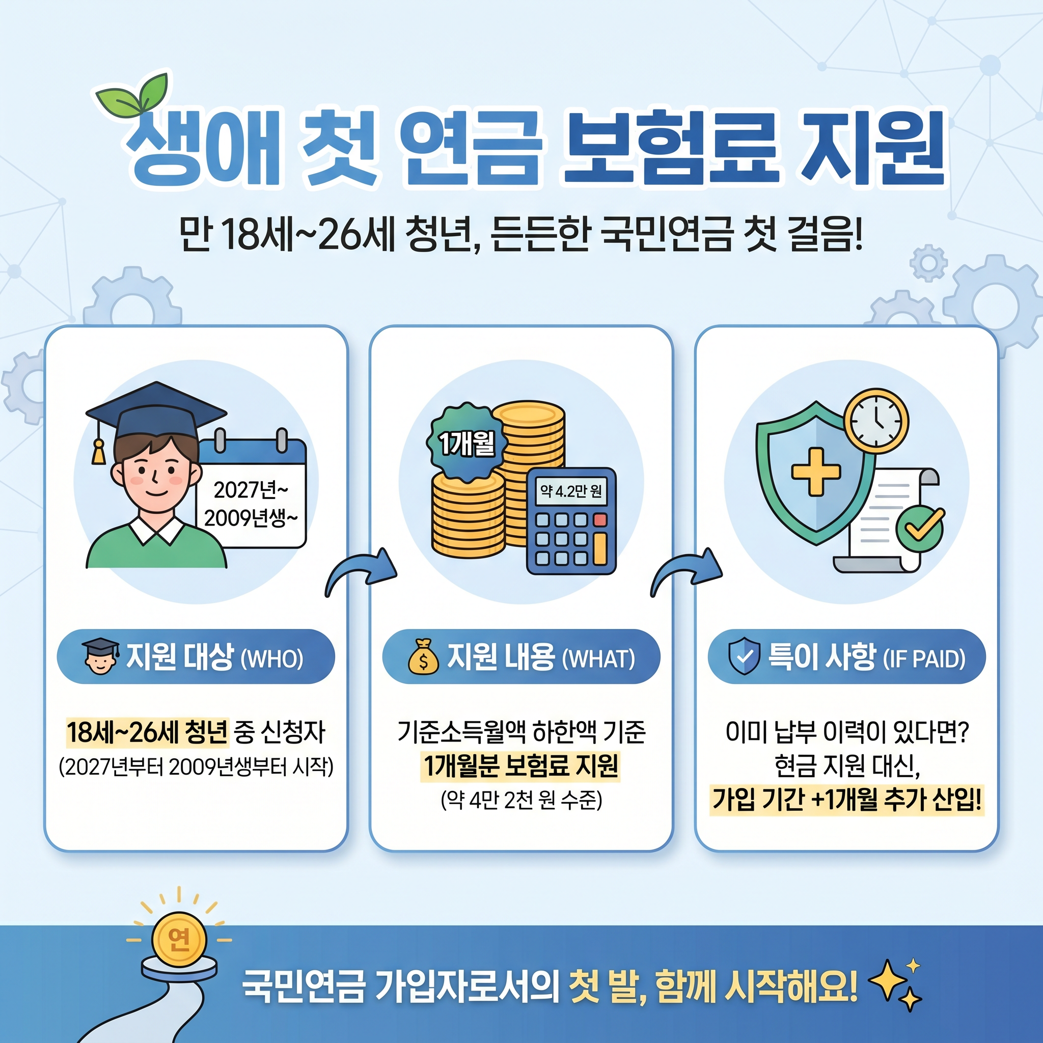 지금까지 생애 첫 연금보험료 지원 제도에 대해 꼼꼼히 살펴보았는데요. 2009년생 자녀를 둔 부모님이나 해당 연령대의 청년분들은 2027년부터 시행되는 생애 첫 연금보험료 지원을 꼭 기억해 두셨다가 신청하시길 바랍니다. 생애 첫 연금보험료 지원을 통해 든든한 미래를 설계해 보세요!