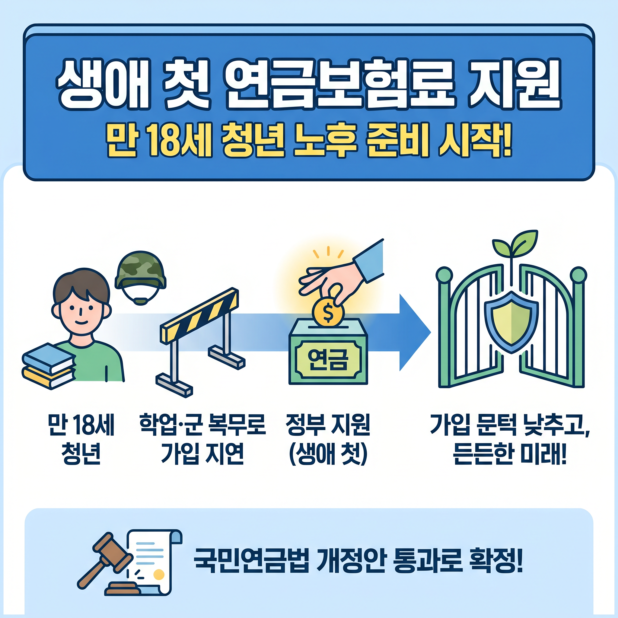 정부는 청년들의 노후 준비를 돕기 위해 생애 첫 연금보험료 지원 사업을 시작합니다. 학업이나 군 복무로 국민연금 가입이 늦어지는 것을 방지하기 위해, 만 18세 청년들에게 생애 첫 연금보험료 지원을 통해 가입 문턱을 낮춰주는 것이 핵심이에요. 이번 생애 첫 연금보험료 지원은 최근 국민연금법 개정안이 국회 본회의를 통과하면서 확정되었답니다.