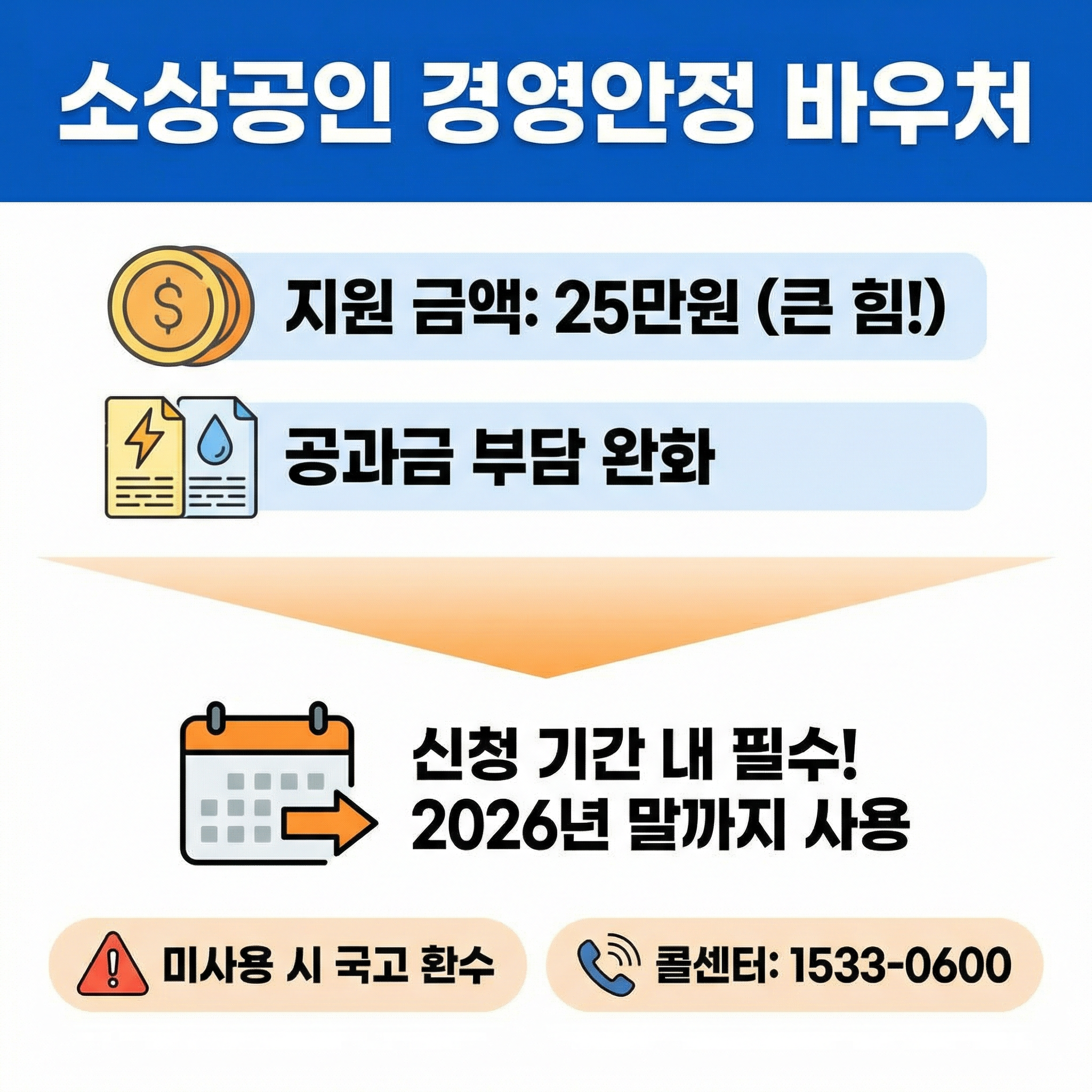 반드시 정해진 기간 내에 소상공인 경영안정 바우처를 신청하시고, 사용 기한인 26년 말까지 알뜰하게 사용하시길 바라요. 미사용 된 소상공인 경영안정 바우처 포인트는 국고로 환수되니 꼭 기억하세요. 더 궁금한 점은 소상공인 경영안정 바우처 콜센터(1533-0600)로 문의하시면 친절하게 안내받으실 수 있어요.