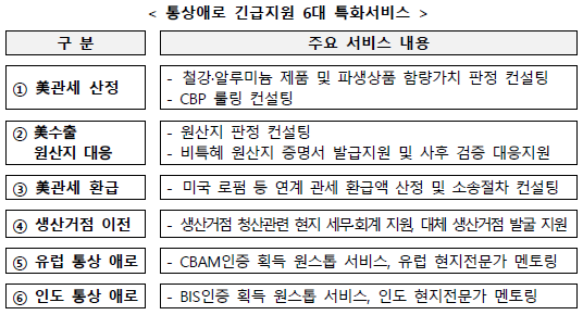 미국 관세 산정, 원산지 대응, 관세 환급, 생산거점 이전, 유럽 CBAM 대응, 인도 BIS 인증 등 6대 특화 서비스가 제공돼요. 단순 정보 제공이 아니라, 국내외 전문가와 직접 연계해 실질적인 해결책을 제시해주는 구조라 활용도가 매우 높아요. 연 3회 모집 방식이라 긴급 상황에서도 비교적 빠르게 신청할 수 있다는 점도 장점이에요.