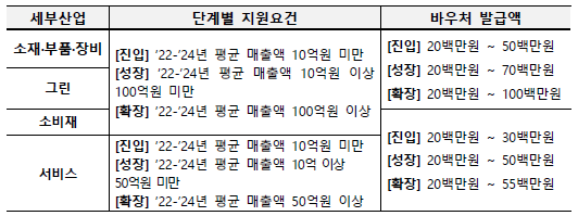산업바우처는 소재·부품·장비, 그린 산업, 소비재, 서비스 산업 분야의 중소·중견기업을 대상으로 해요. 최근 3년 평균 매출액을 기준으로 진입·성장·확장 단계로 나뉘며, 단계에 따라 최소 2천만 원에서 최대 1억 원까지 바우처를 지원받을 수 있어요.