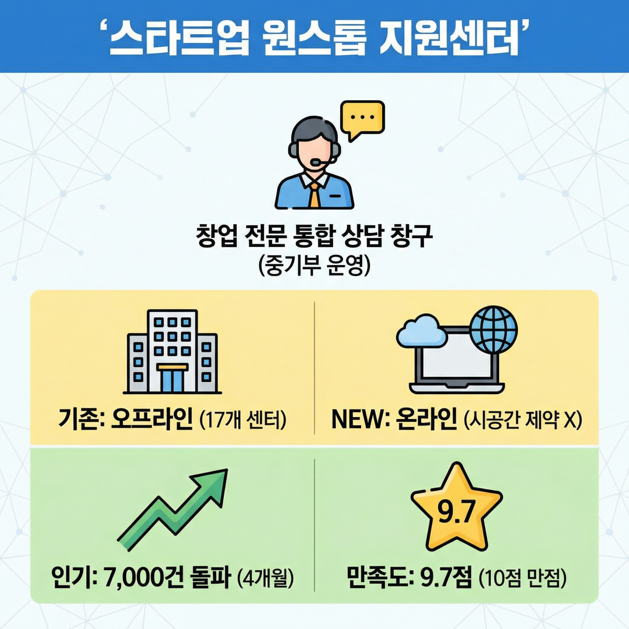 실제로 오프라인 센터 운영 4개월 만에 상담 7,000건을 돌파할 정도로 인기가 대단했는데요. 이용자 만족도가 10점 만점에 9.7점에 달할 만큼 스타트업 원스톱 지원센터의 상담 퀄리티는 매우 높기로 유명해요.