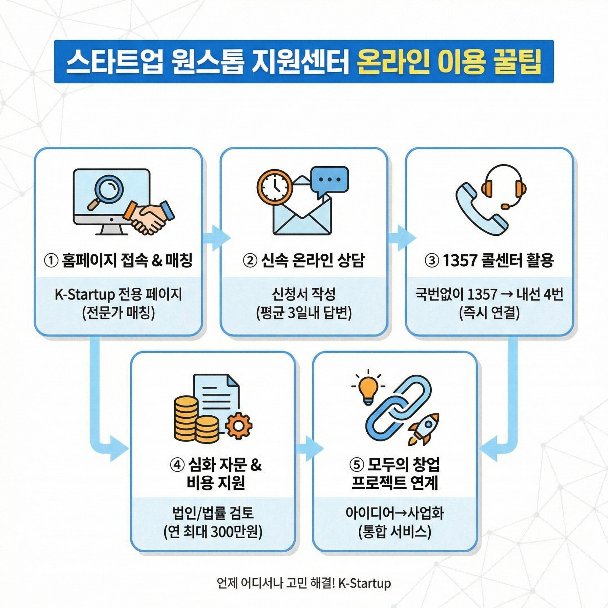 - 1357 통합 콜센터 활용: 온라인 접속이 어렵다면 국번 없이 1357을 누른 후 내선번호 4번을 선택하세요. 스타트업 원스톱 지원센터 전담 상담사와 즉시 연결되어 맞춤형 안내를 받을 수 있습니다.