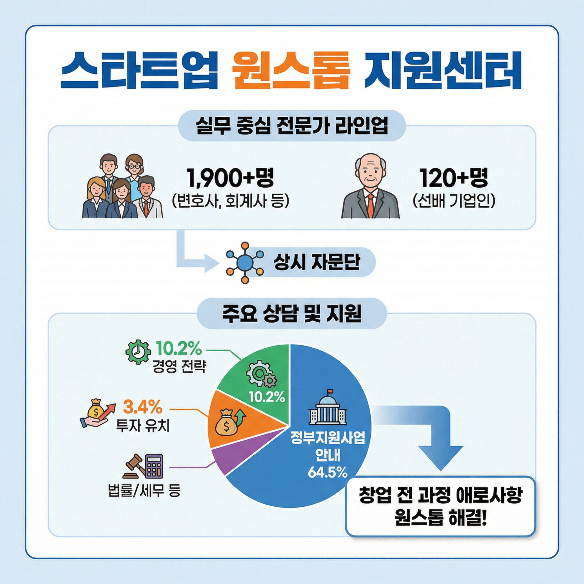 - 전문가 라인업: 변호사, 회계사, 노무사 등 1,900여 명의 분야별 전문가와 대기업 대표이사 출신 등 성공한 선배 기업인 120여 명이 스타트업 원스톱 지원센터 자문단으로 상시 대기 중입니다.