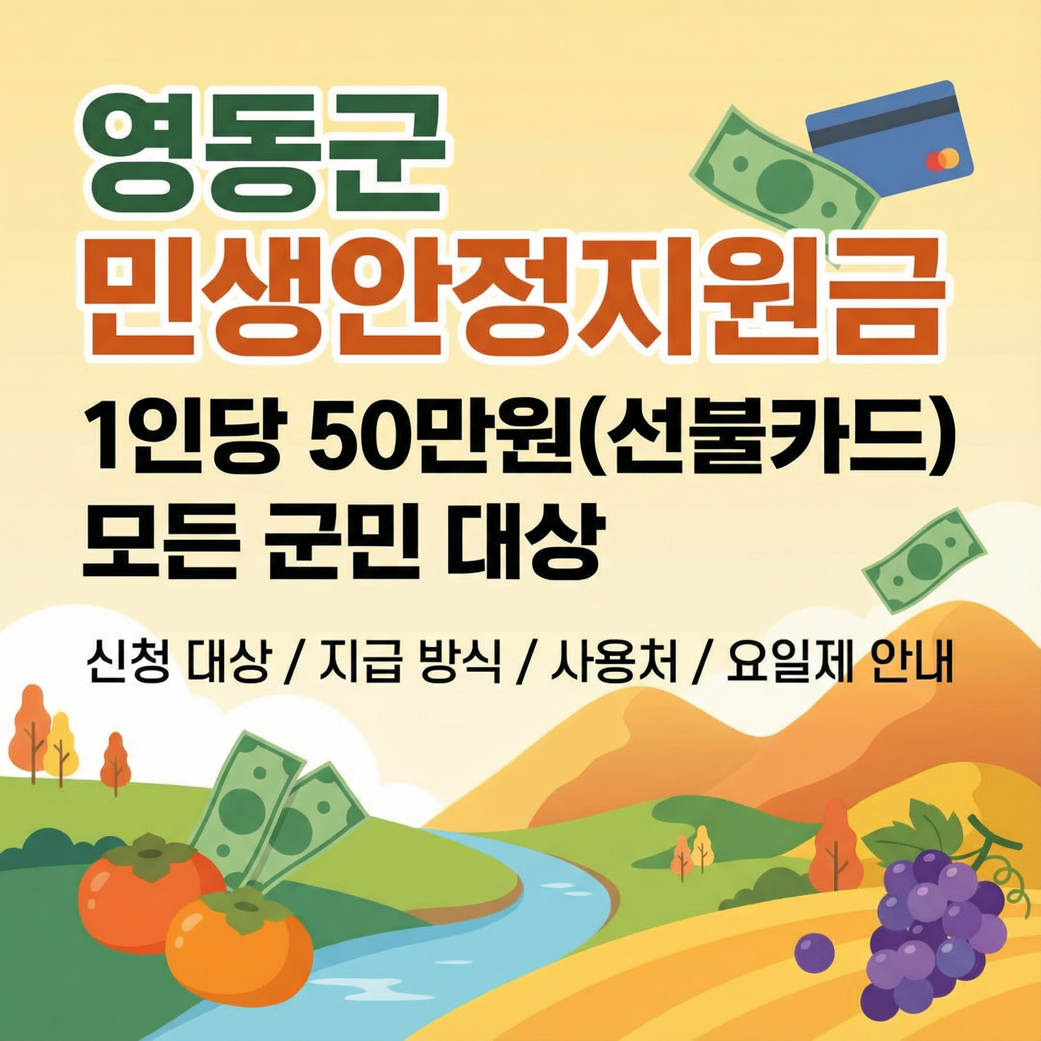2026년 1월, 충북 영동군이 드디어 모든 군민을 대상으로 민생안정지원금을 지급합니다. 이번 민생안정지원금 정책은 영동군 지역경제 활성화와 주민 생활 안정을 목표로 추진되며, 1인당 50만원을 선불카드로 제공하는 파격적인 지원책입니다.
