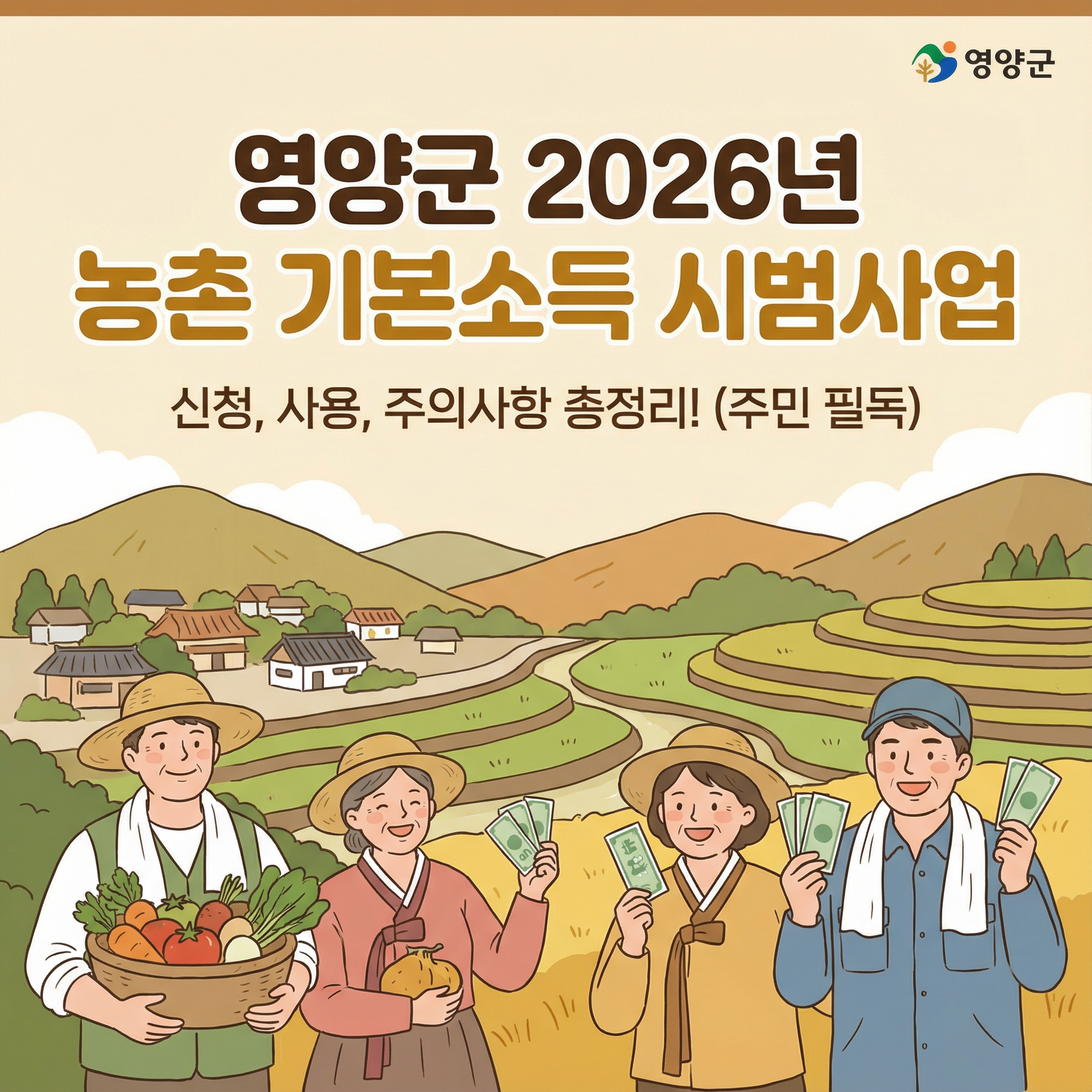 영양군에서 2026년부터 본격 시행 예정인 ‘농촌 기본소득 시범사업’에 대해 아주 자세하고 쉽게 알려드릴게요. 농촌 주민이라면 반드시 알아야 할 신청 대상, 신청 방법, 준비서류, 사용방법, 주의사항까지 모두 정리했어요.