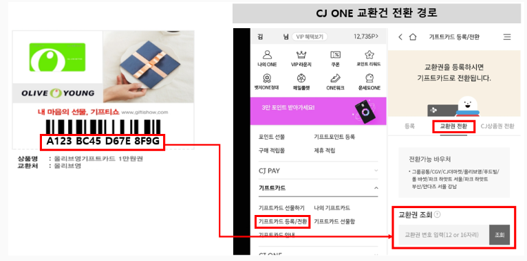 - CJ ONE 앱 > 기프트카드 > 바우처 전환 등록 필요