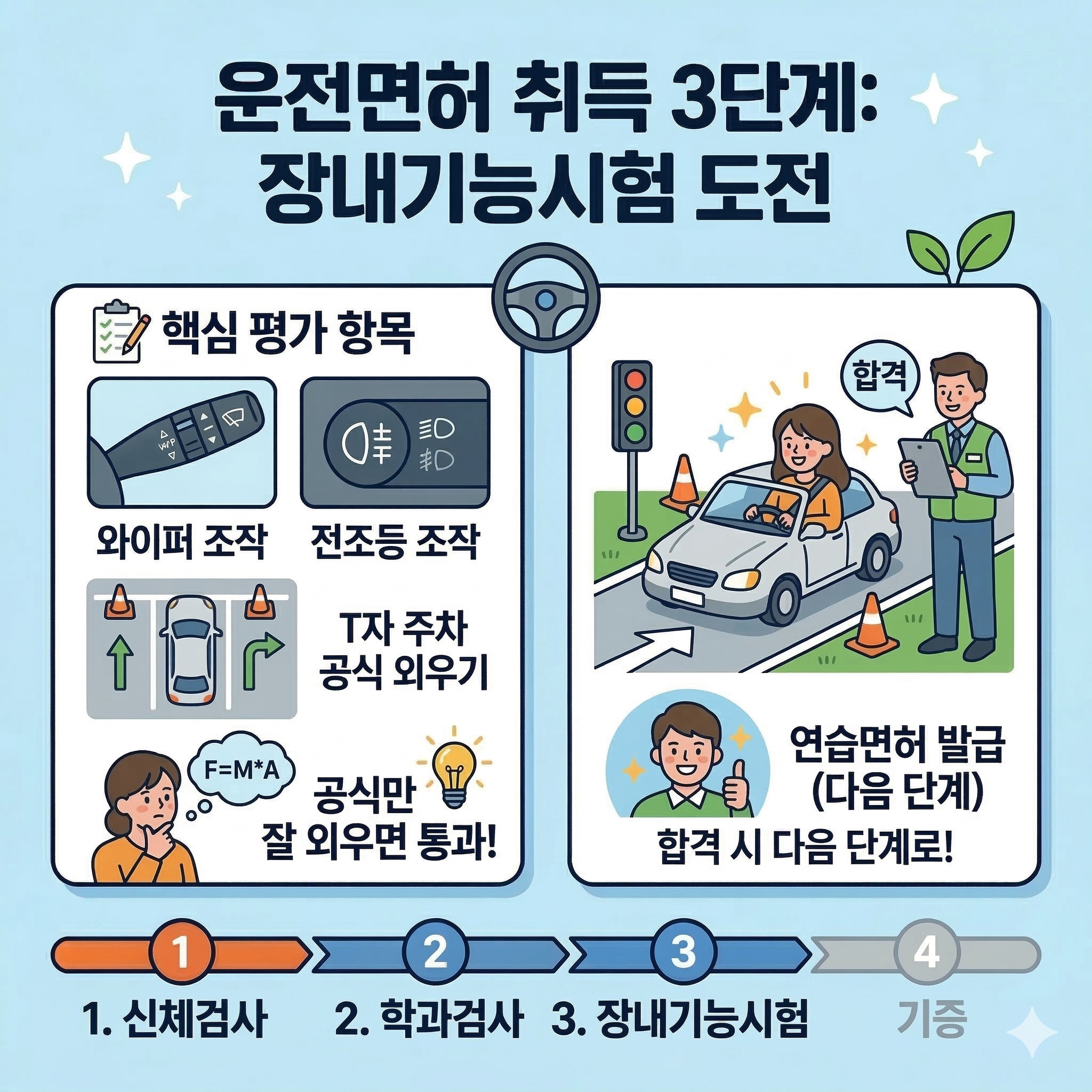 학과시험에 합격했다면 이제 실제 차를 타보는 운전면허 취득절차인 장내기능시험 단계예요. 시험장 내 코스를 돌며 와이퍼 조작, 전조등 조작, T자 주차 등을 평가받게 되는데요. 많은 분이 이 운전면허 취득절차에서 어려움을 겪으시곤 해요. 하지만 공식만 잘 외우면 충분히 통과할 수 있는 운전면허 취득절차이니 너무 걱정하지 마세요. 기능시험에 합격하면 연습면허가 발급되며 다음 운전면허 취득절차로 넘어갑니다.