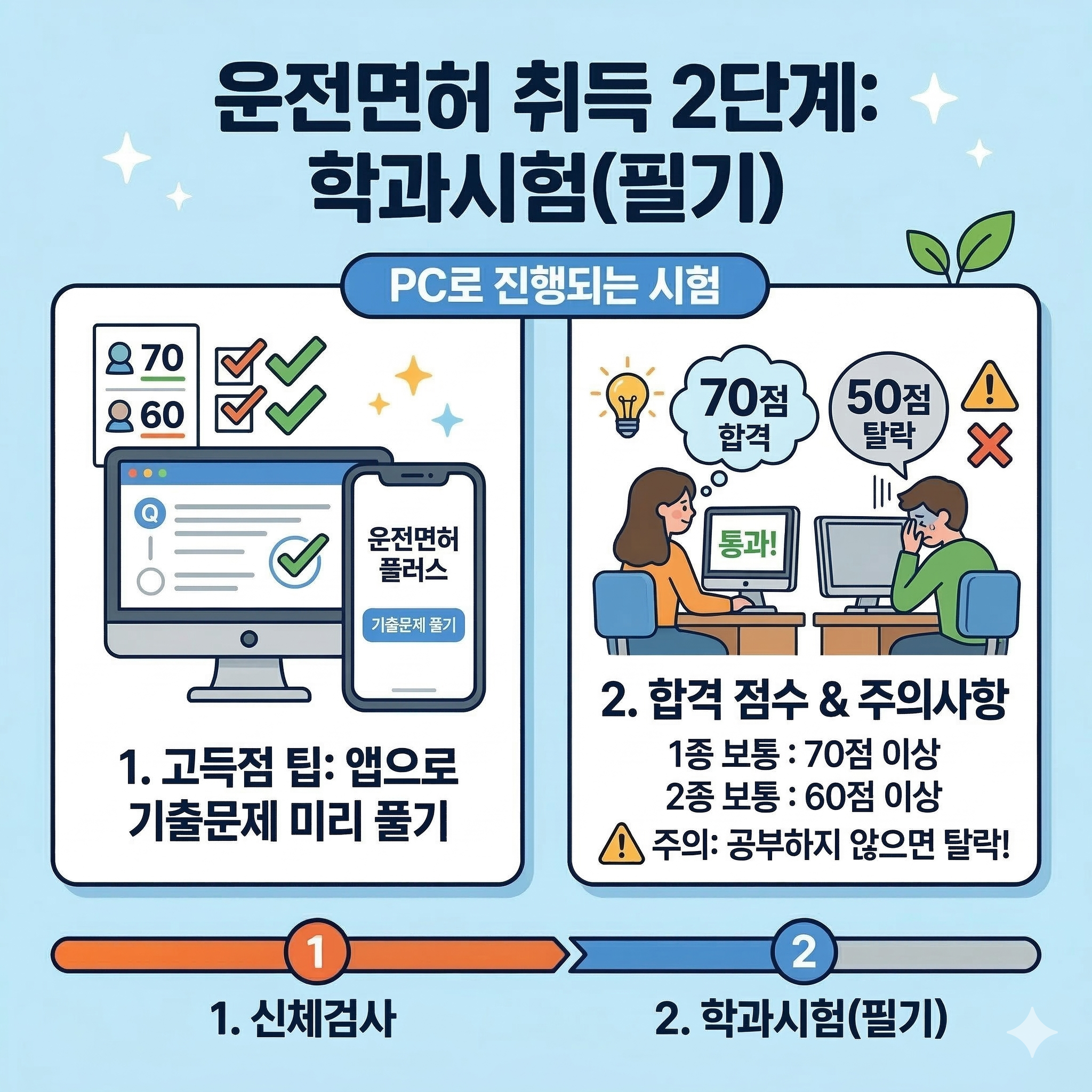 신체검사를 마쳤다면 이제 운전면허 취득절차 중 가장 기본이 되는 학과시험(필기)을 치러야 해요. PC로 진행되는 이 시험은 1종 보통은 70점, 2종 보통은 60점 이상이면 합격이에요. 운전면허 취득절차를 빠르게 진행하고 싶다면 미리 '운전면허 플러스' 같은 앱으로 기출문제를 풀어보는 것이 좋아요. 공부하지 않고 갔다가는 의외로 떨어질 수 있는 운전면허 취득절차 단계이니 주의하세요!
