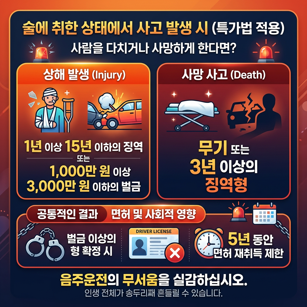 만약 술에 취한 상태에서 사람을 다치게 하거나 사망에 이르게 한다면 어떻게 될까요? 이때는 일반적인 음주운전 벌금기준이 아니라 '특정범죄 가중처벌 등에 관한 법률'이 적용됩니다.