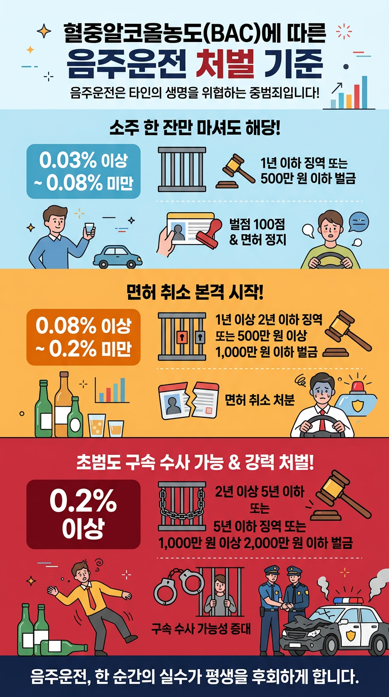 - 0.08% 이상 ~ 0.2% 미만: 본격적으로 면허가 취소되는 구간입니다. 1년 이상 2년 이하의 징역 또는 500만 원 이상 1,000만 원 이하의 음주운전 벌금기준 처벌을 받게 됩니다.