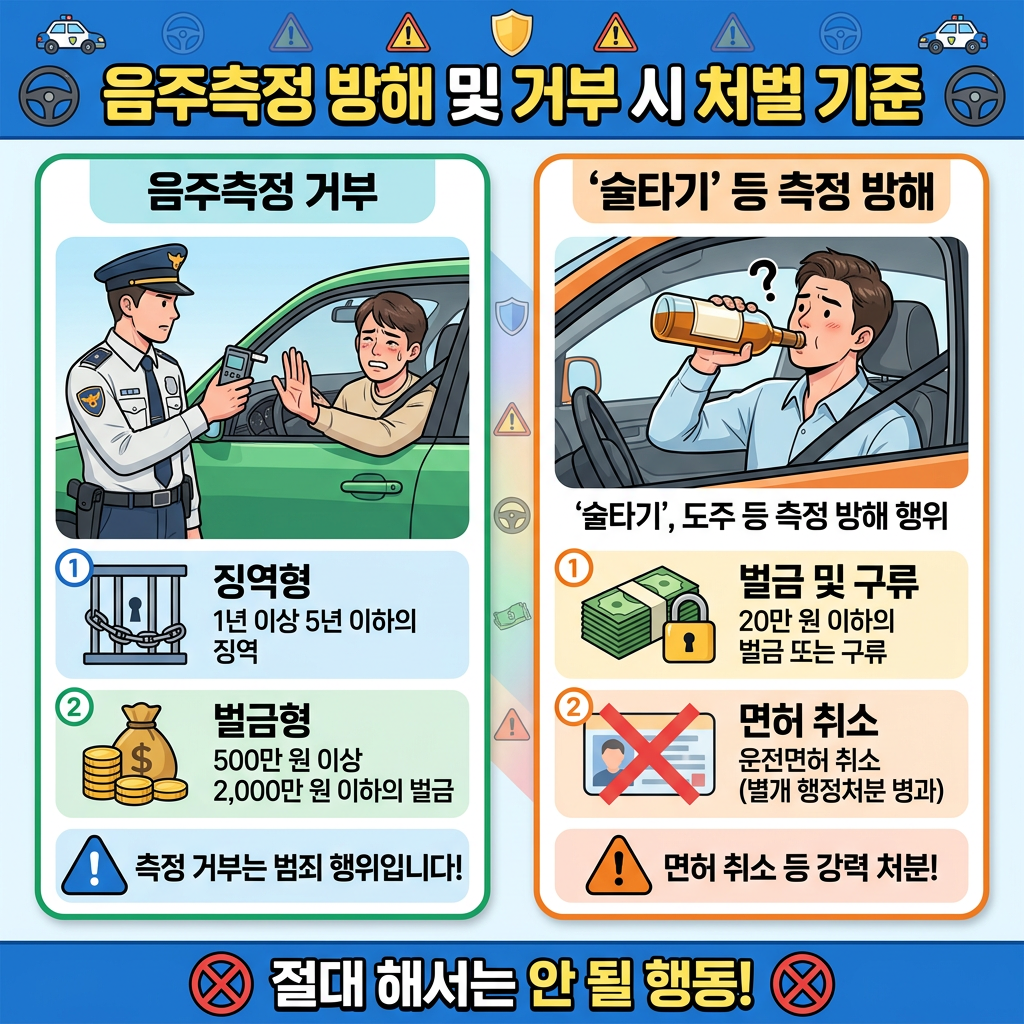특히 최근에는 '술타기'라고 불리는 음주측정 방해행위(단속 전 추가 음주 등)에 대해서도 20만 원 이하의 벌금이나 구류 처분은 물론, 음주운전 벌금기준과는 별개로 운전면허 취소라는 강력한 행정처분이 병과되므로 절대 해서는 안 될 행동입니다.