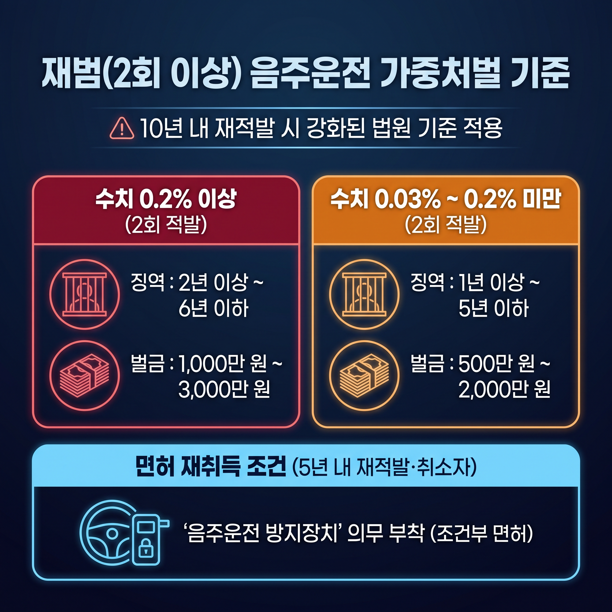 - 2회 적발(수치 0.2% 이상): 2년 이상 6년 이하의 징역이나 1,000만 원 이상 3,000만 원 이하의 벌금.