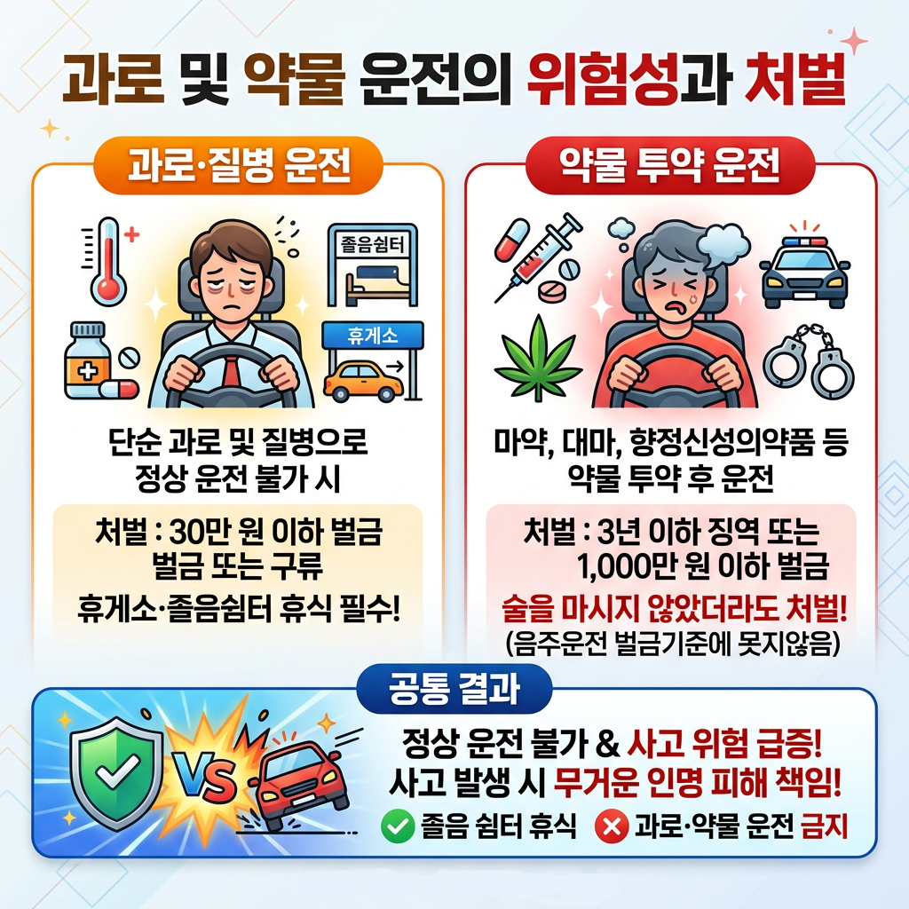 단순 과로나 질병으로 인해 정상 운전이 어려운 경우에도 30만 원 이하의 벌금이나 구류 처분을 받을 수 있으니, 졸음이 쏟아지거나 몸이 좋지 않을 때는 반드시 휴게소나 졸음쉼터에서 휴식을 취해야 합니다. 사고 발생 시에는 음주운전 벌금기준보다 훨씬 무서운 인명 피해 책임이 따르기 때문입니다.