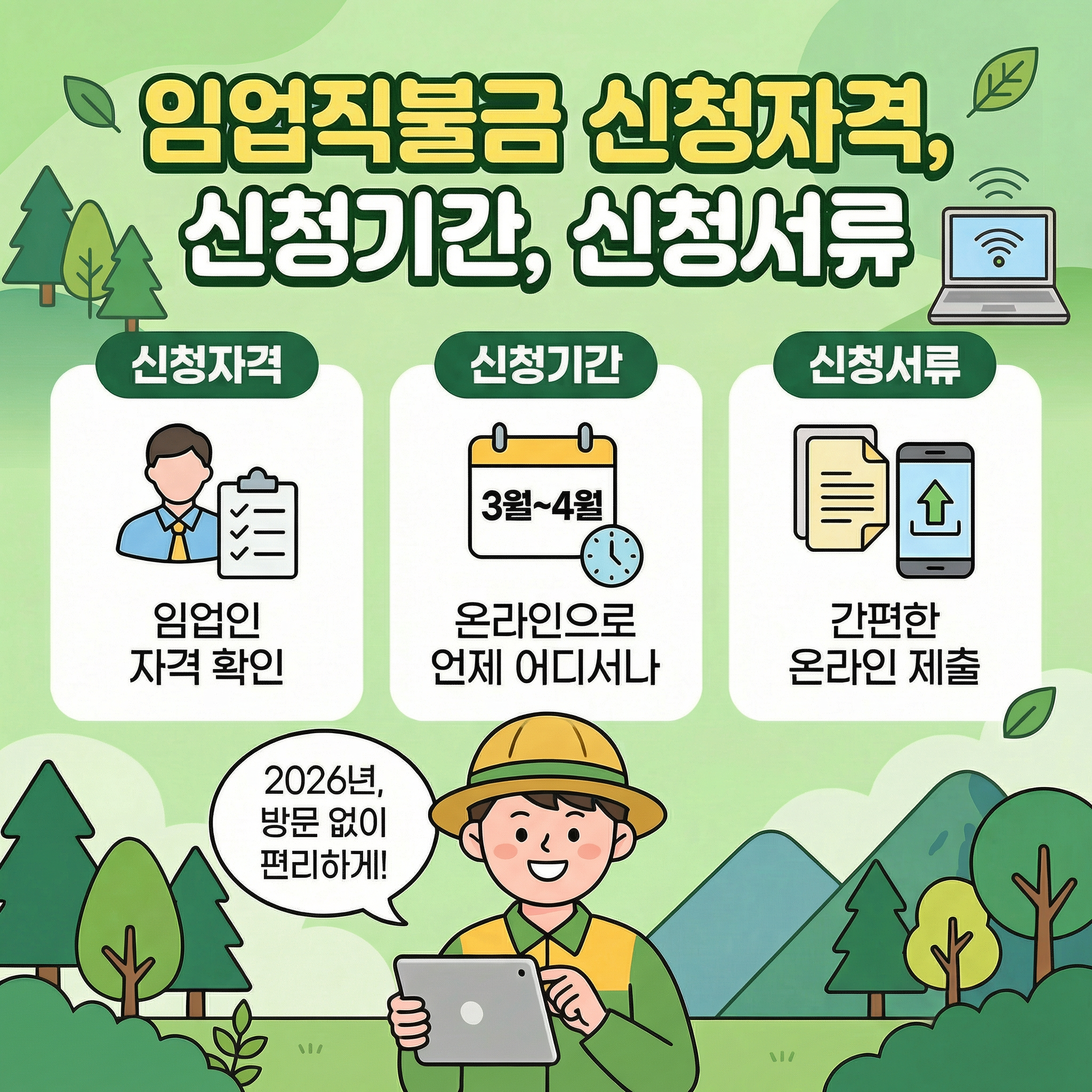 2026년 임업직불금 신청자격, 신청기간, 신청서류를 정리해드릴게요. 신청을 준비 중이라면 끝까지 꼭 읽어보세요.