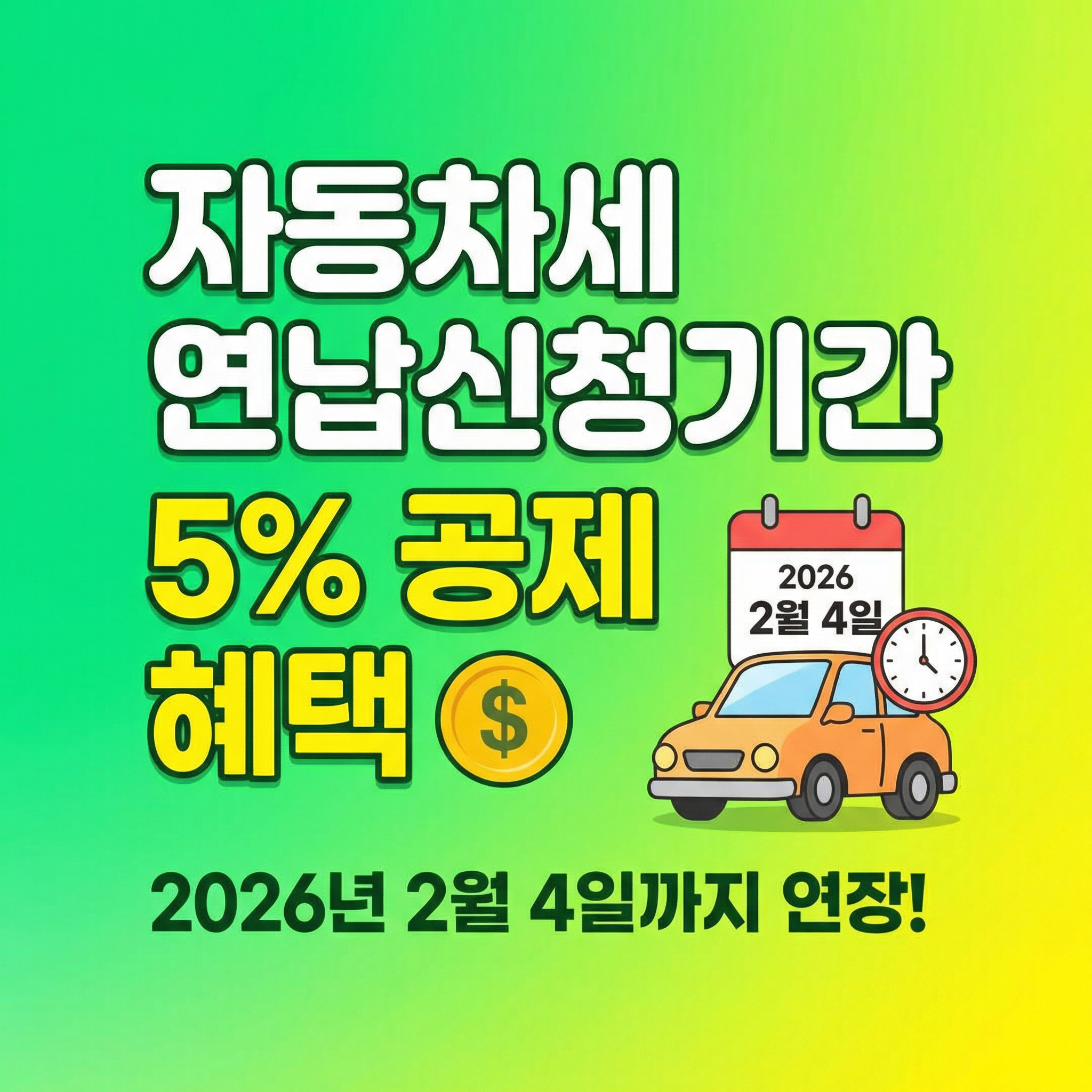 2026년 자동차세 연납신청기간은 2월 4일까지이며, 이후에는 공제 혜택 없이 정기분으로 납부해야 해요.
