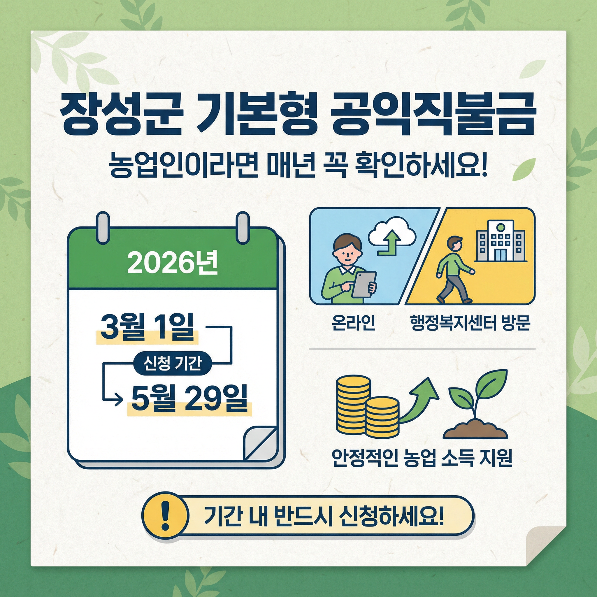 농업을 하고 계신 분들이라면 매년 꼭 확인해야 하는 지원제도가 바로 기본형 공익직불금이에요. 특히 전남 장성군 농업인이라면 2026년 기본형 공익직불금 신청 기간과 조건을 미리 확인해 두는 것이 중요해요.