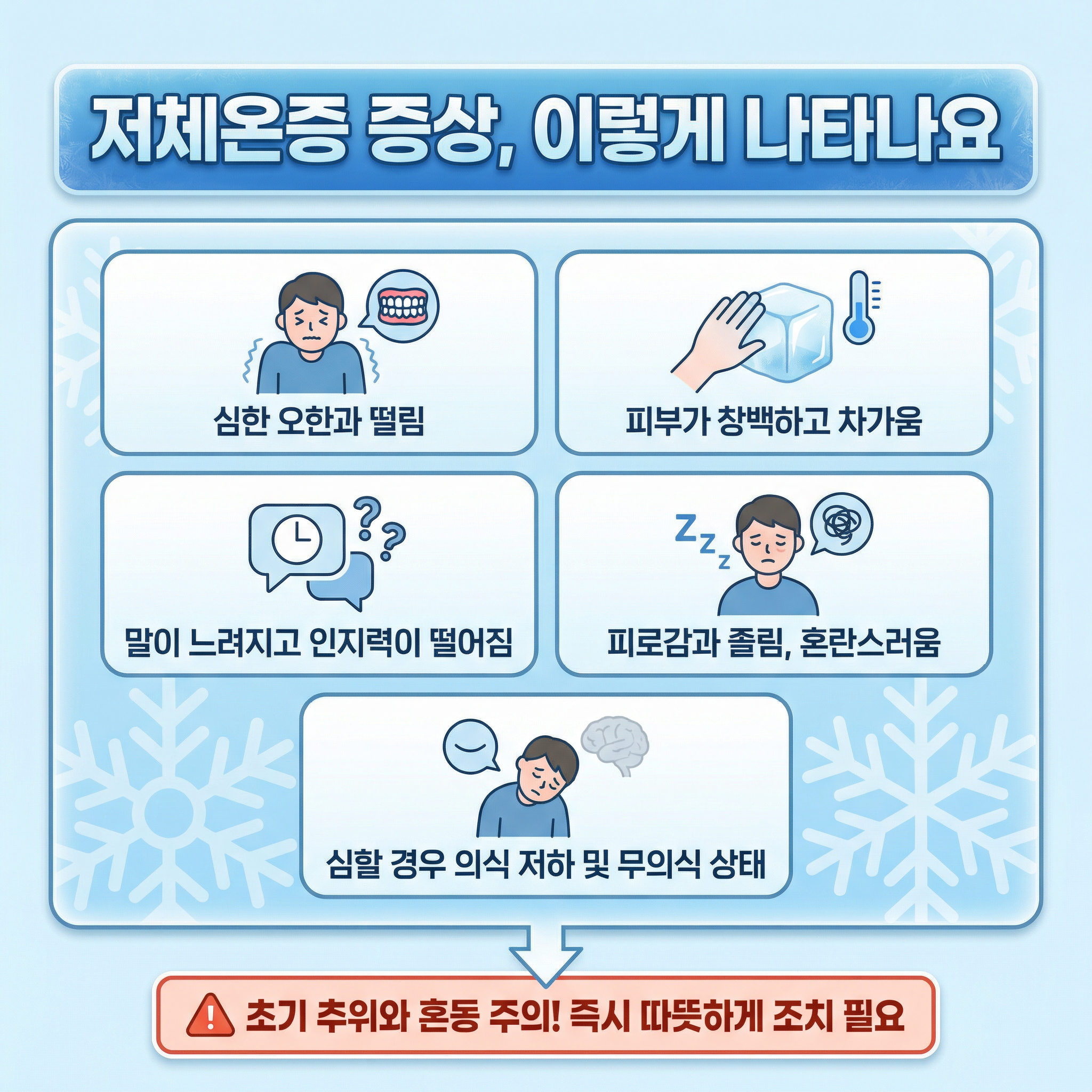 이번 겨울에는 한파에 대비해 저체온증 증상을 미리 알고 실천하는 겨울철 건강지킴이가 되어보세요!