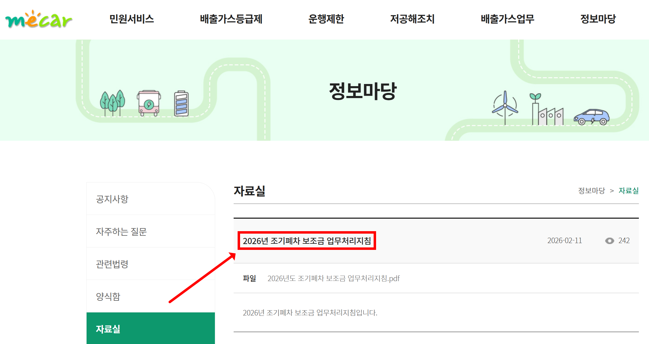 - 자동차 배출가스 종합전산시스템(mecar)을 통해 조기폐차 보조금 지급대상 확인 신청서를 제출하면 돼요.