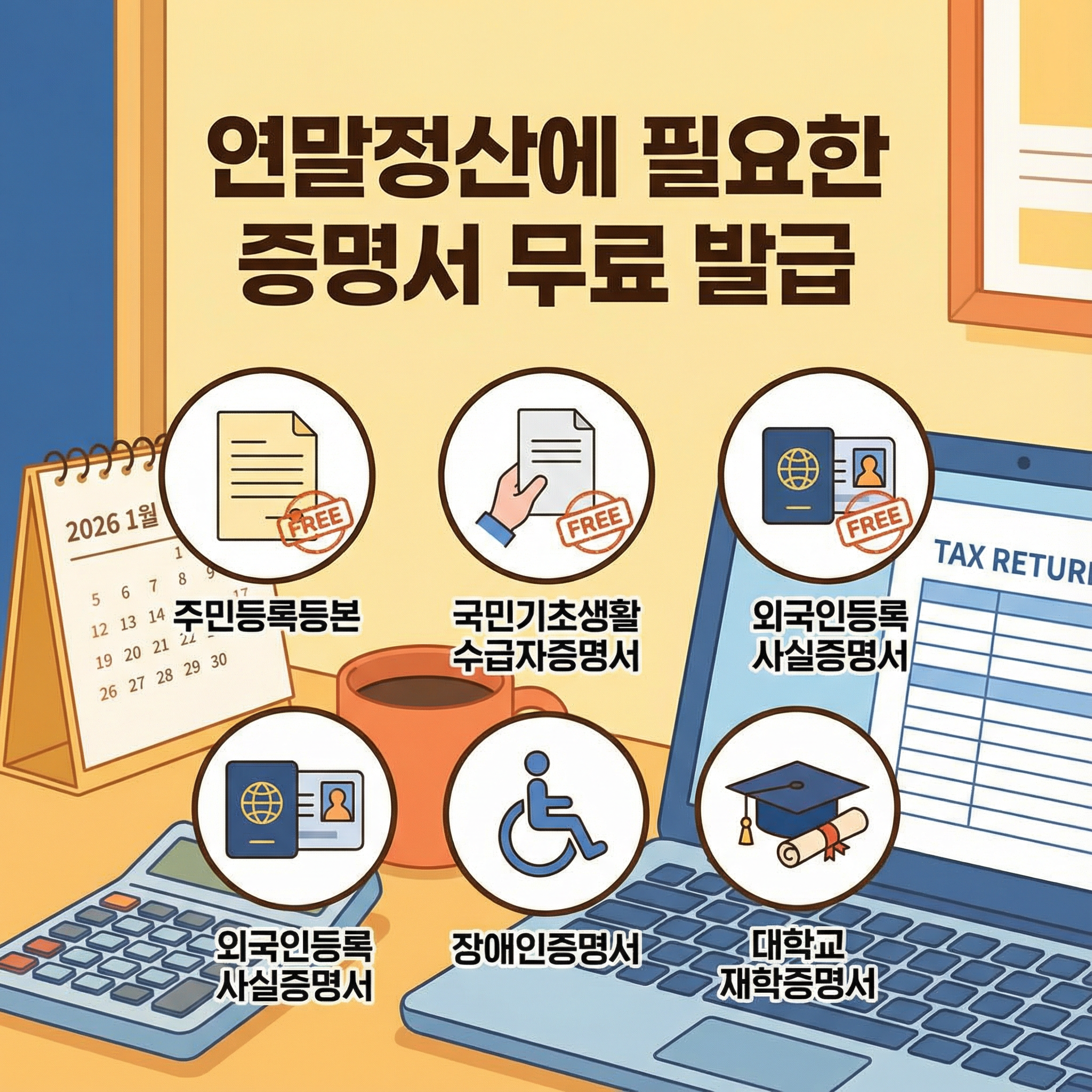 2026년 1월부터 연말정산 시즌이 본격적으로 시작되면서, 많은 분들이 주민등록등본, 국민기초생활수급자증명서, 외국인등록사실증명서, 장애인증명서, 대학교 재학증명서 같은 증빙서류 발급 방법에 대해 궁금해하실 거예요.