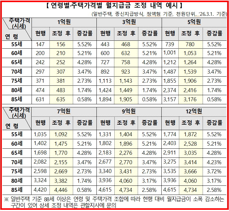 - 평균 가입자(72세, 4억 원 주택 기준)는 기존 월 129만 7천 원 → 133만 8천 원으로 인상