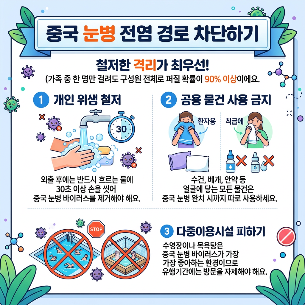 - 공용 물건 사용 금지: 수건, 베개, 안약 등 얼굴에 닿는 모든 물건은 중국 눈병 완치 시까지 따로 사용하세요.