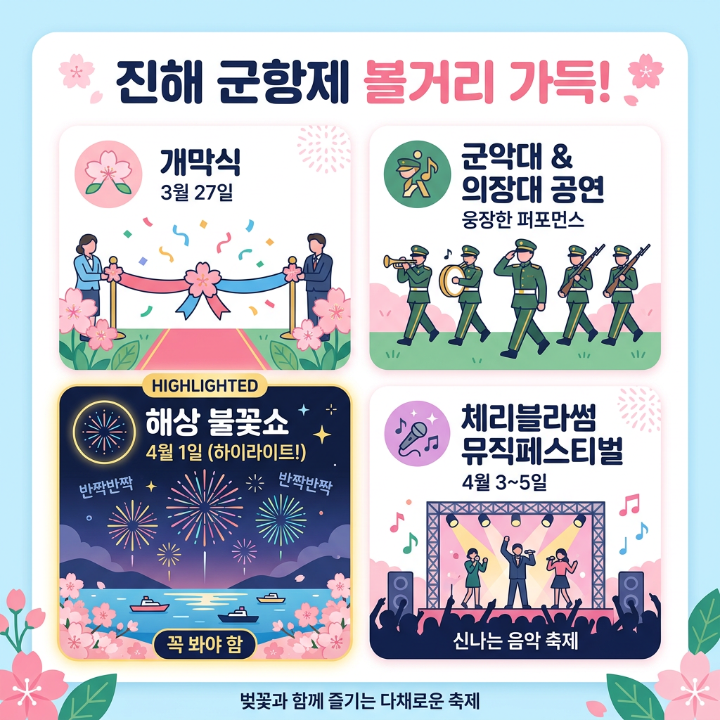 진해 군항제 벚꽃 축제는 단순히 꽃만 보는 축제가 아니에요. 다양한 프로그램이 함께 구성되어 있어요.