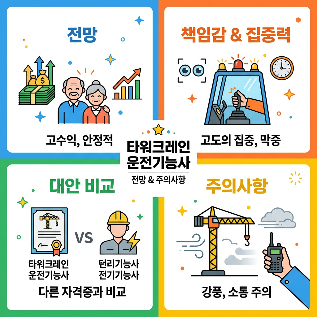 타워크레인 운전기능사는 건설 현장의 꽃이라 불릴 만큼 책임감이 막중한 직업이에요. 높은 수입만큼이나 고도의 집중력이 요구되지만, 타워크레인 운전기능사만이 가질 수 있는 자부심과 안정적인 노후 보장은 그 어떤 직업보다 매력적입니다. 만약 타워크레인 운전기능사 외에 다른 대안을 찾는다면 에너지관리기능사나 전기기능사도 좋지만, 단기 고수익을 목표로 한다면 역시 타워크레인 운전기능사가 최선의 선택입니다.