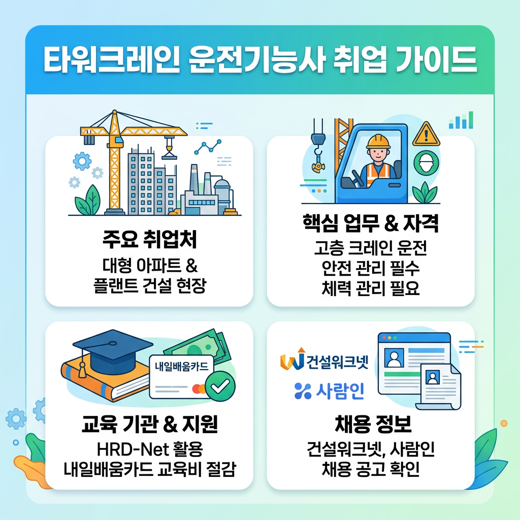 타워크레인 운전기능사 자격을 따면 주로 대형 아파트 건설 현장이나 플랜트 공사 현장에서 근무하게 됩니다. 타워크레인 운전기능사는 고층에서 작업하기 때문에 안전 관리가 무엇보다 중요하며, 이를 위한 체력 관리도 필수적이죠. 교육의 경우 HRD-Net을 통해 내일배움카드를 활용하면 타워크레인 운전기능사 교육비를 대폭 절감할 수 있으니 꼭 활용해 보세요. 타워크레인 운전기능사 채용 정보는 건설워크넷이나 사람인 같은 대형 포털에서도 쉽게 찾아볼 수 있습니다.