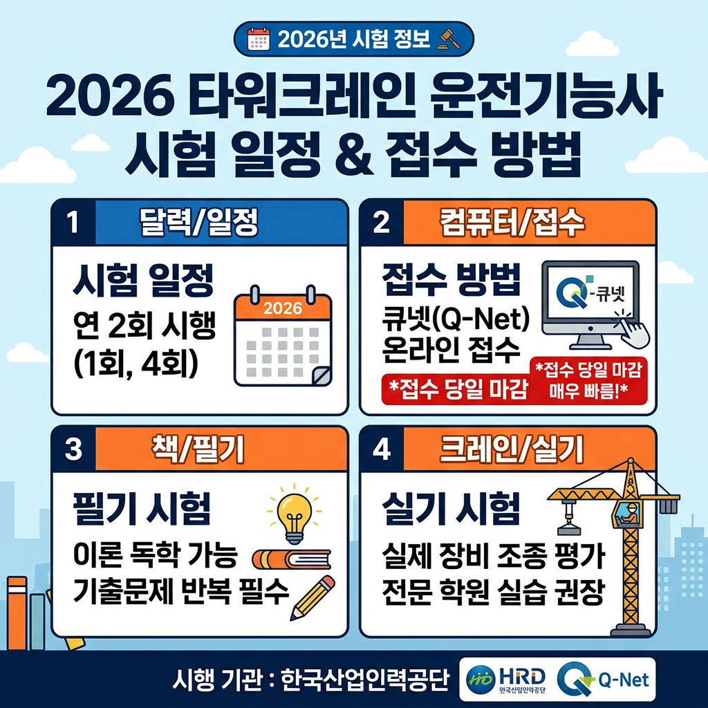 타워크레인 운전기능사 자격증은 한국산업인력공단에서 시행하며 큐넷(Q-Net)을 통해 접수할 수 있어요. 2026년 타워크레인 운전기능사 정기 시험은 보통 연 2회(1회, 4회) 진행되므로 일정을 미리 체크하는 것이 중요해요.