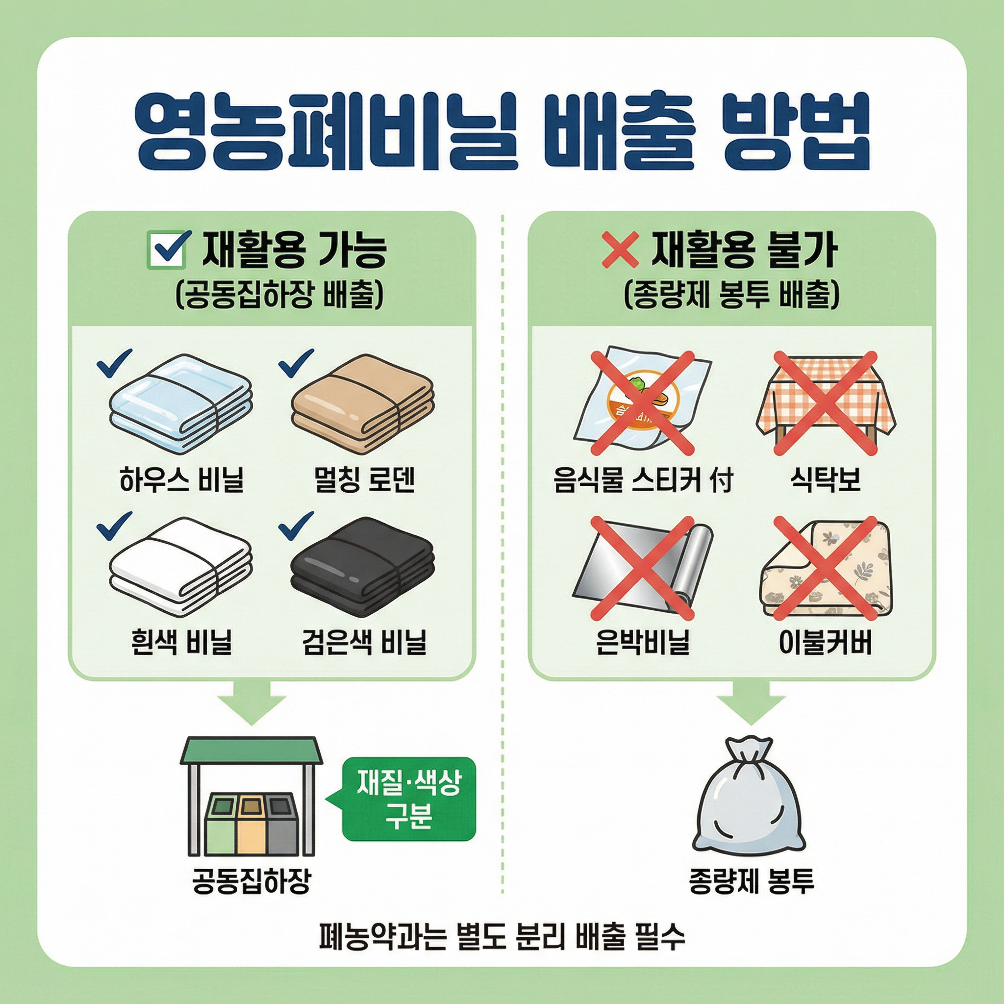 영농폐비닐은 재질과 색상에 따라 구분하여 공동집하장에 배출합니다.
