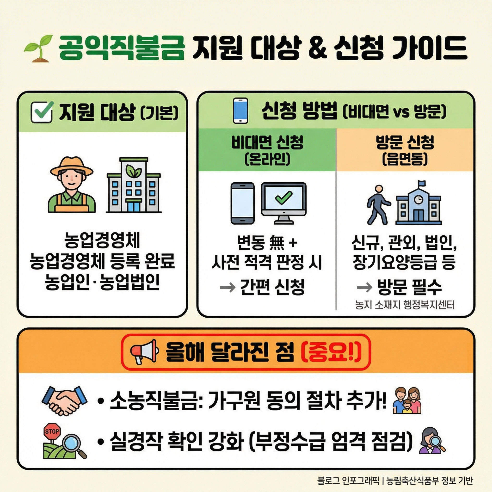 2026년 공익직불금은 농가 소득에 직접적인 도움이 되는 중요한 제도예요. 특히 소농은 130만원 정액 지원을 받을 수 있어 반드시 신청해야 해요.