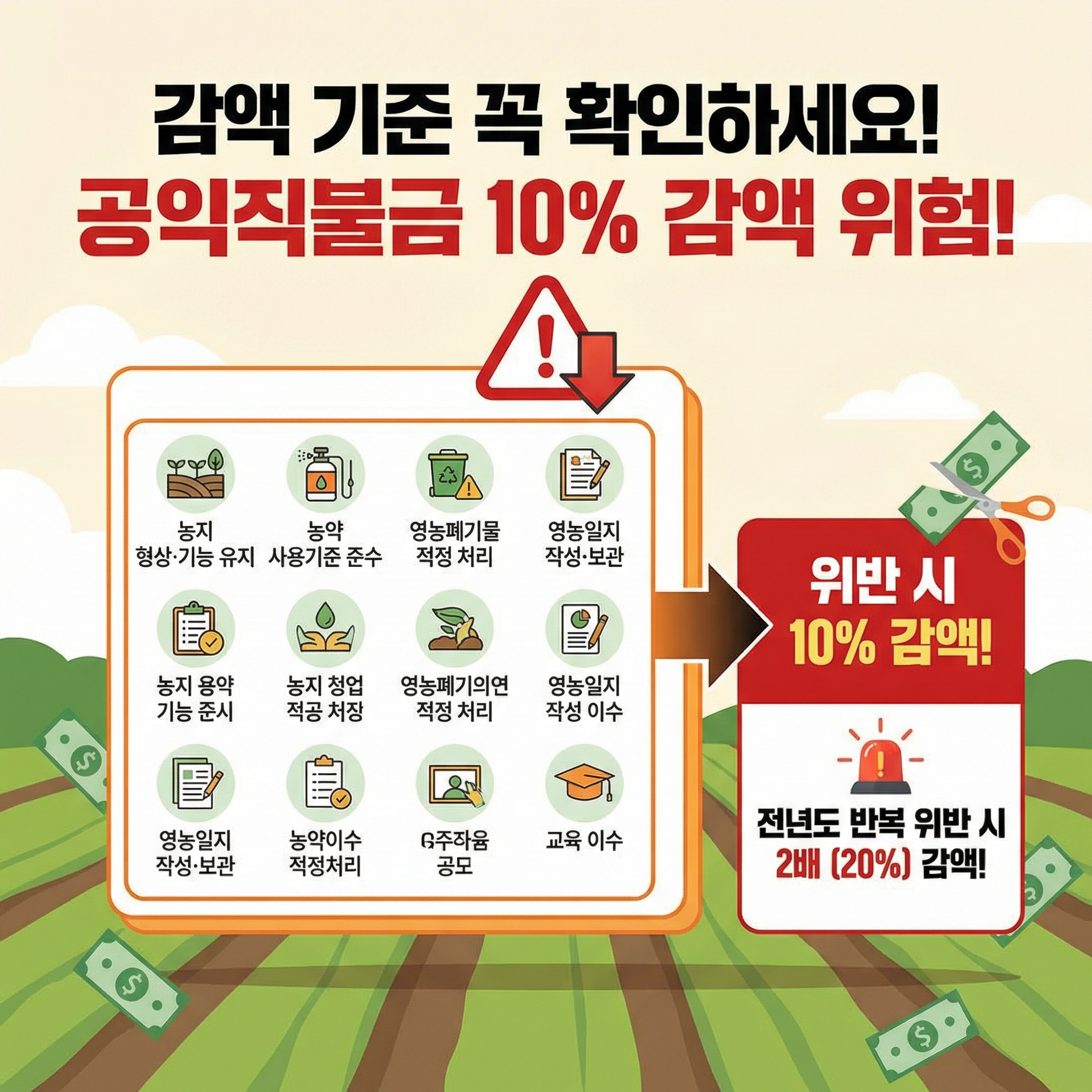 전년도 위반을 반복하면 감액 비율이 2배 적용돼 공익직불금 수령액이 크게 줄어들 수 있어요.