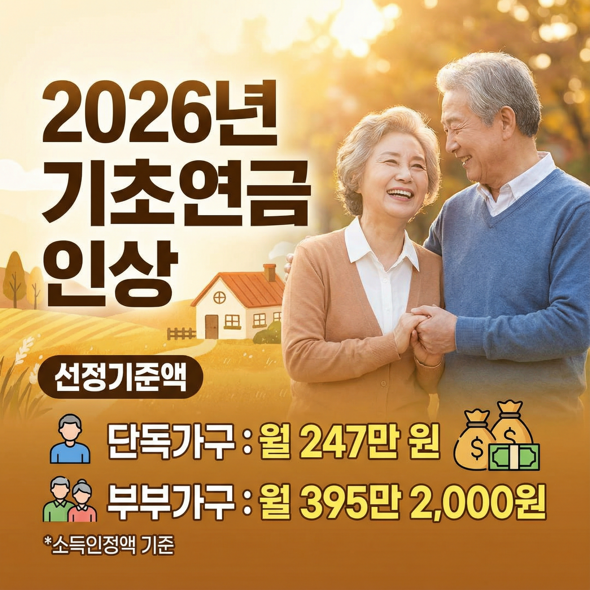 보건복지부에 따르면, 2026년 기초연금 선정기준액이 단독가구 기준 월 247만 원, 부부가구 기준 월 395만 2,000원으로 인상됐어요. 2025년보다 단독가구 기준 19만 원 증가(약 8.3%)된 수치예요.