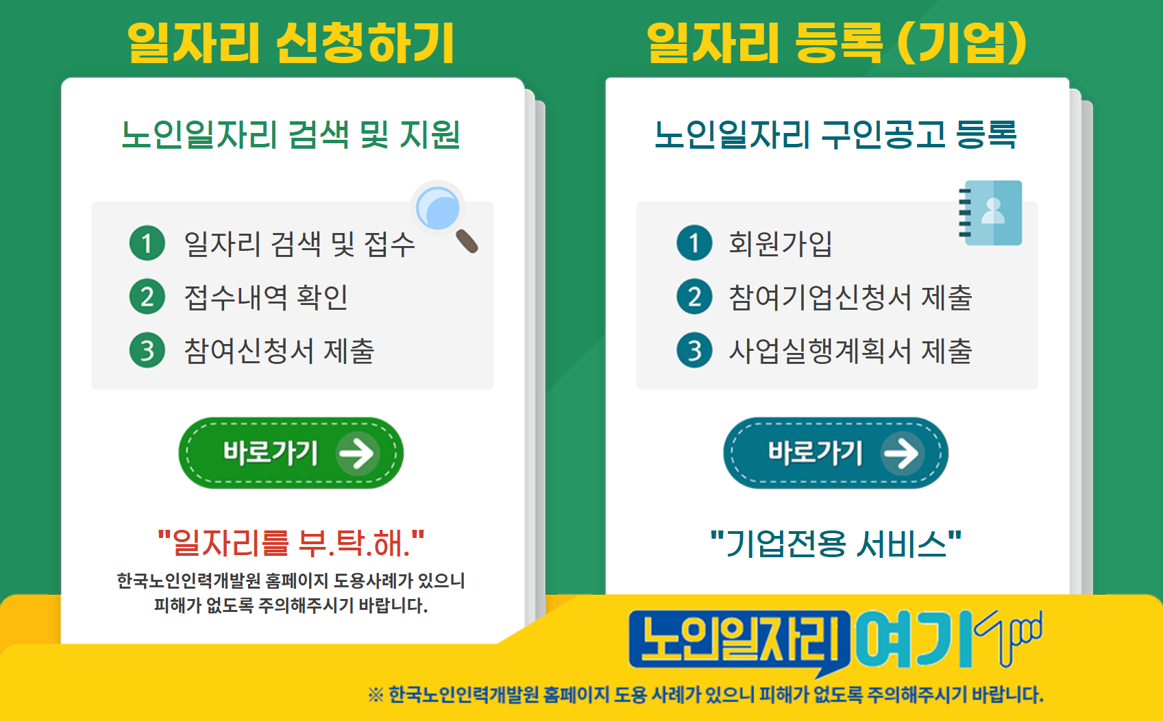 - 온라인: 노인일자리여기 사이트 접속 → 지역 검색 → 일자리 선택 후 신청