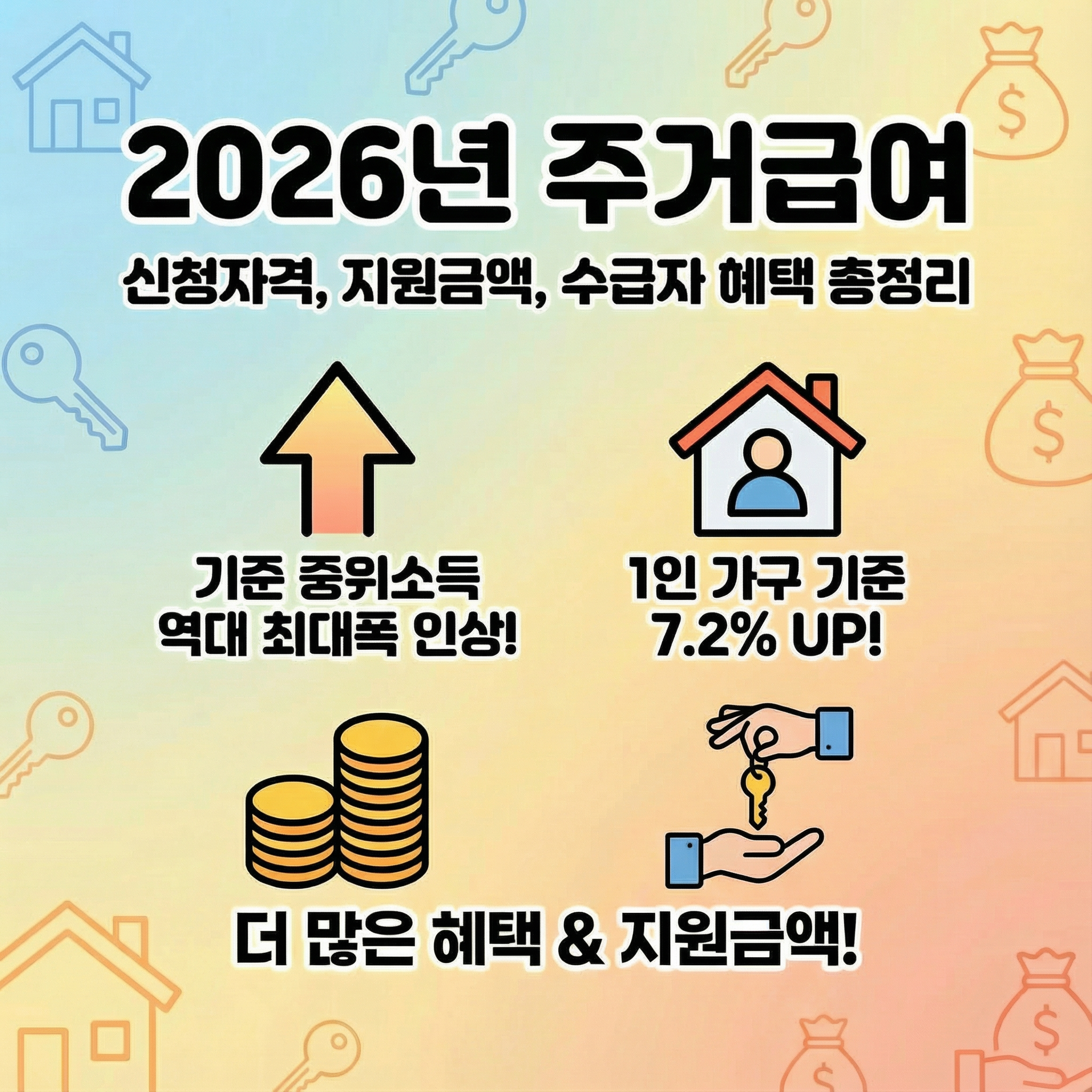 2026년부터 기준 중위소득이 역대 최대폭으로 인상되면서, 주거급여 신청자격과 수급 조건에도 큰 변화가 생겼어요. 특히 1인 가구 기준 기준 중위소득이 7.2%나 올라, 더 많은 분들이 주거급여 신청자격을 갖추게 되었답니다. 오늘은 2026년 주거급여 신청자격, 지원금액, 그리고 수급자들이 받을 수 있는 다양한 혜택을 정리해 드릴게요.